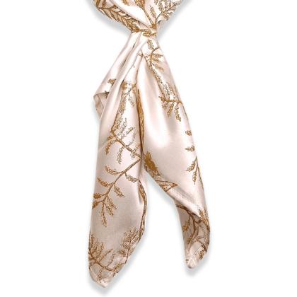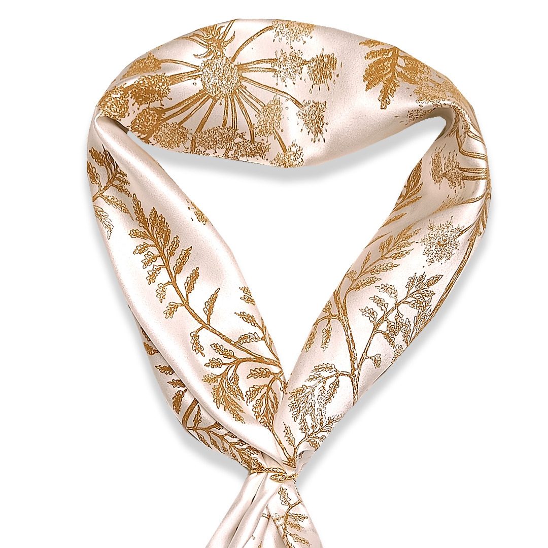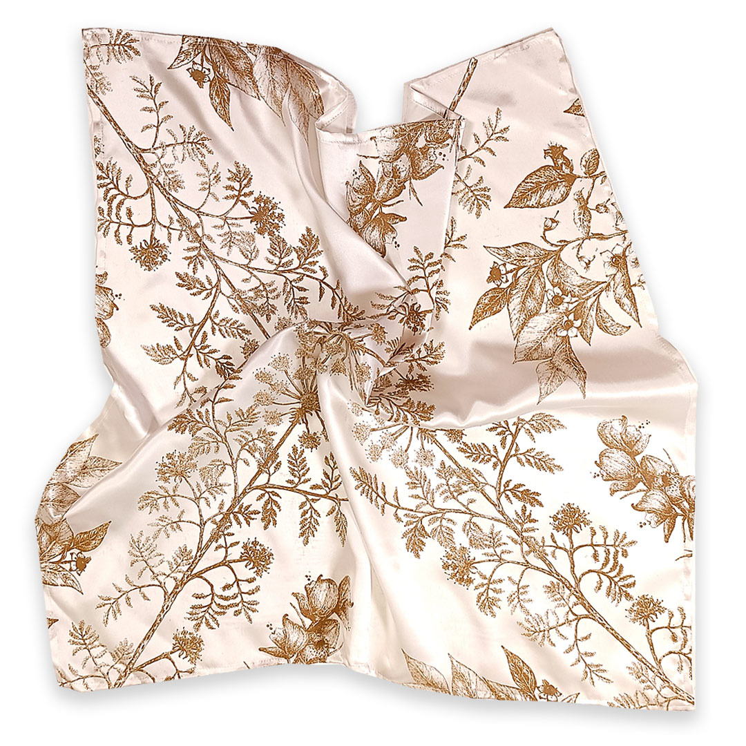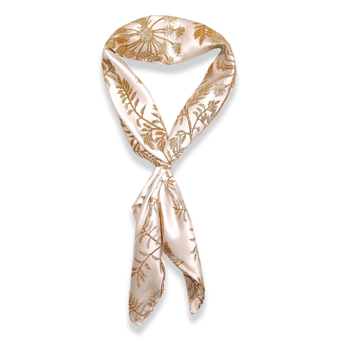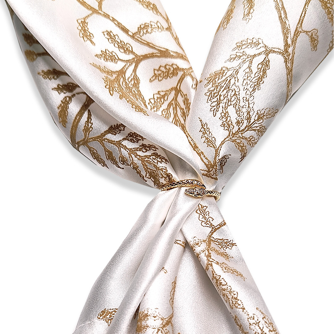 Pure white silk satin scarf. Includes a metal ring in the shape of a viper. The print depicts three highly poisonous wild plants found in Alpine pastures: Belladonna, Hemlock, and Acutitus Napello. Entirely produced in-house by Prestorik Italia, the freshest, softest, and most luminous high-quality 100% silk satin fabric, tailored, hand-screened. Measures 70 x 70 cm. Made in Italy.