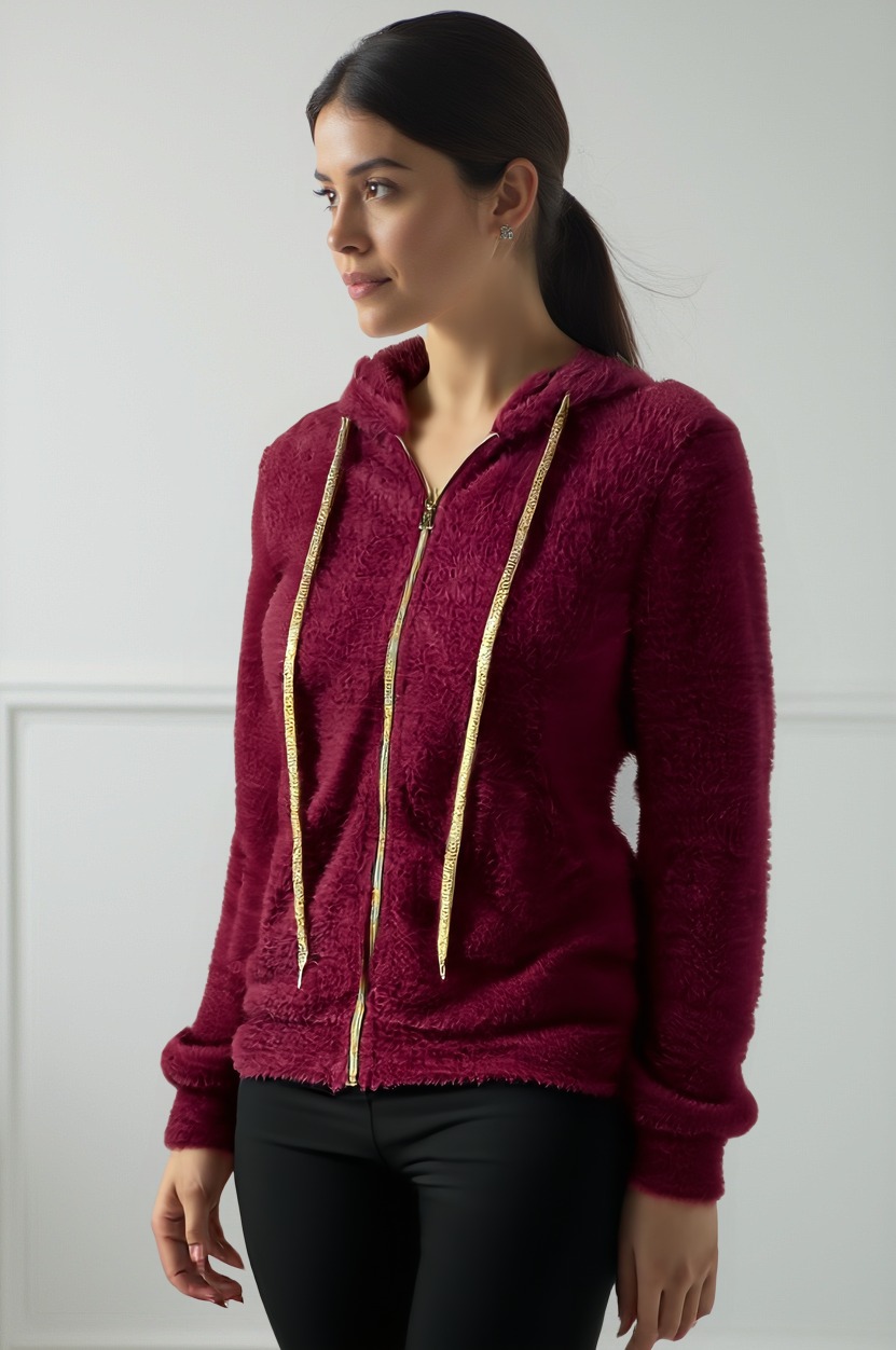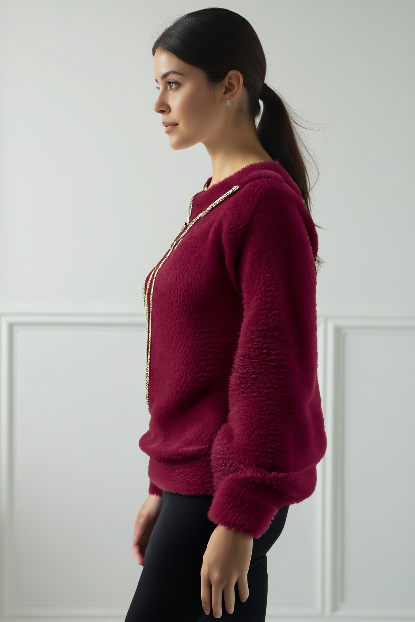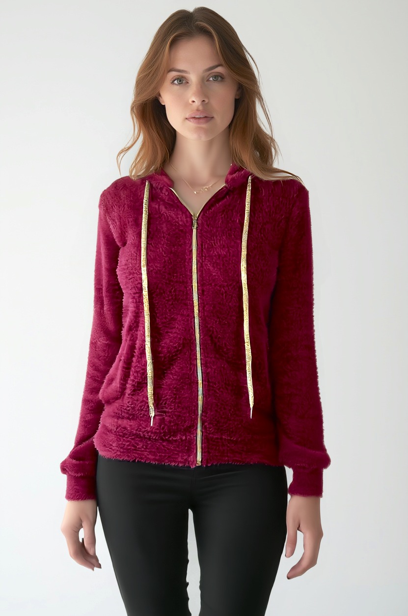 This ultra-soft fur jacket with a hood and zip closure is ideal for colder days. The plush fabric offers warmth and comfort, while the gold ribbon adds a fashionable and bright touch. With front pockets and a comfortable fit, it's perfect for leisure time or weekends, combining style and softness for any occasion.