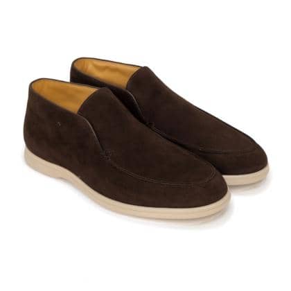 Sleek and minimalist, the AB-2032 is an Italian ankle boot crafted from premium brown suede and fully lined in smooth beige calf leather. Handcrafted in Italy using traditional lasting construction, this model blends modern design with classic craftsmanship. Featuring a lightweight ivory rubber sole and a clean slip-on silhouette, it offers both comfort and casual elegance. Ideal for transitional seasons, this boot is perfect for retailers seeking a stylish yet understated option for smart-casual menswear. Fully customizable through our white label service – clients can select suede or leather options, sole colors, linings, and add their own branding. 100% Made in Italy. Light, elegant, and versatile – this ankle boot is built for refined everyday wear.