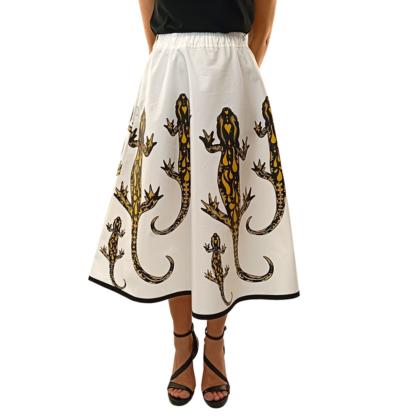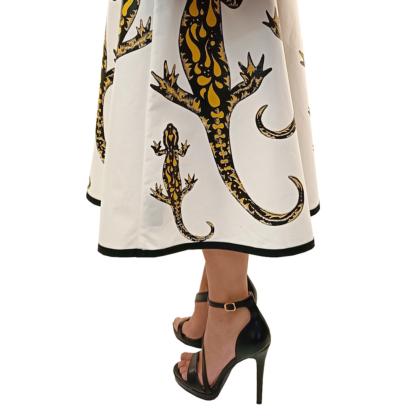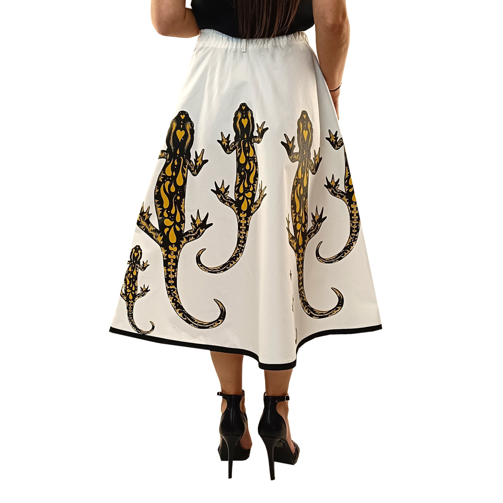 Tailored skirt made from high-quality 100% cotton. Beautiful and salamanders printed all over. Midi length with elastic waistband. Tailored, hand-screened, made in Italy.