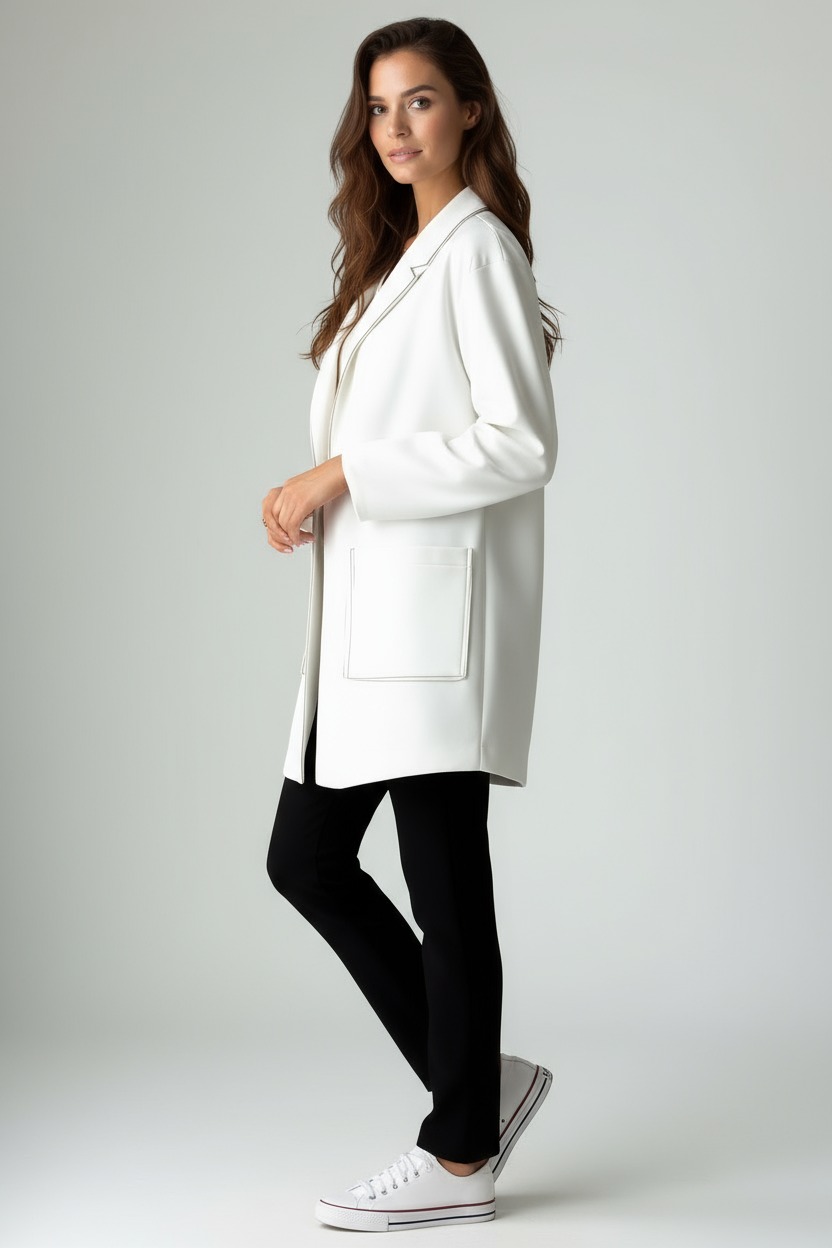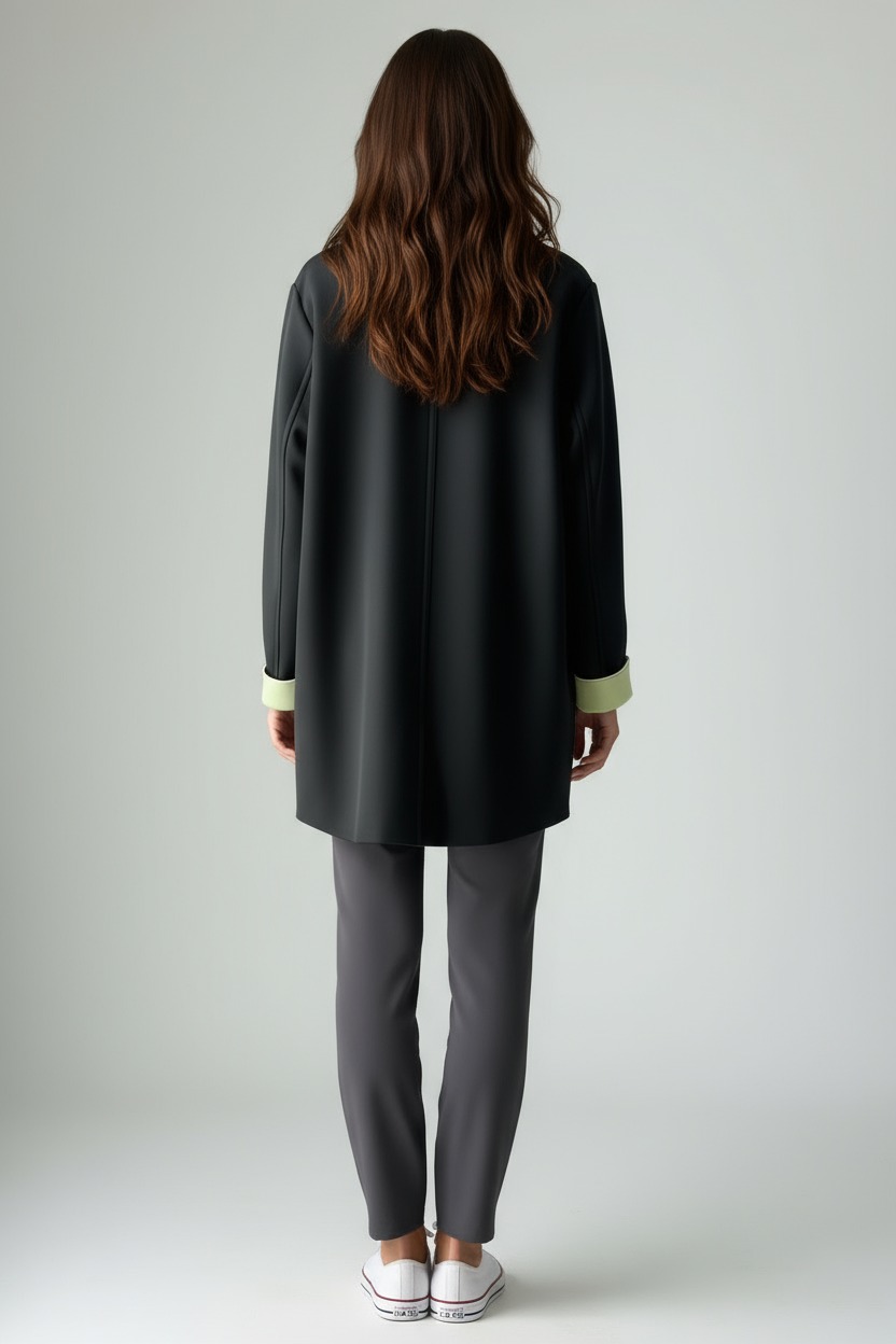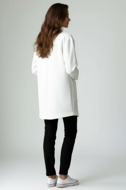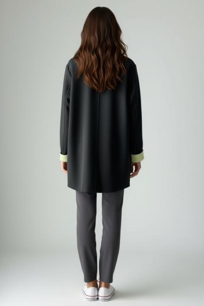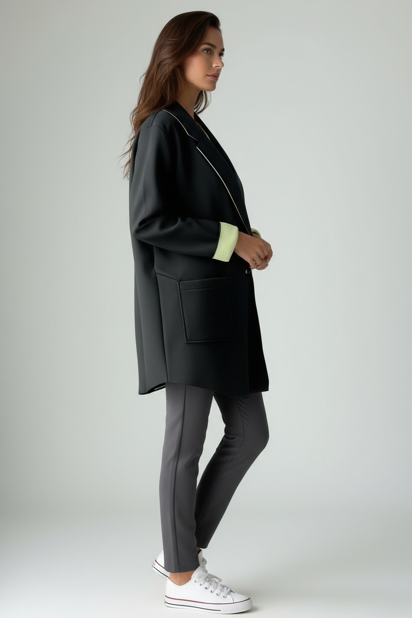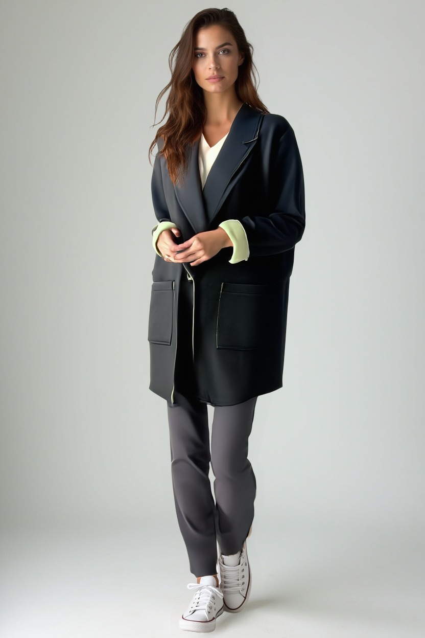 Oversized jacket with dropped shoulders , crafted from a bonded fabric that combines structure and comfort. Contrasting lapels and cuffs add a distinctive, refined touch, while the slightly fitted cut accentuates the silhouette while maintaining a soft line. The single-button closure and large front pockets complete the practical and sophisticated design. Perfect for the office or special occasions, it's a versatile and classy piece, also ideal for the curvy woman who wants to feel elegant and comfortable at all times.