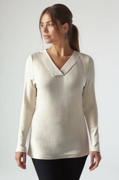 Warm striped sweater with V-neck and long sleeves, soft and comfortable