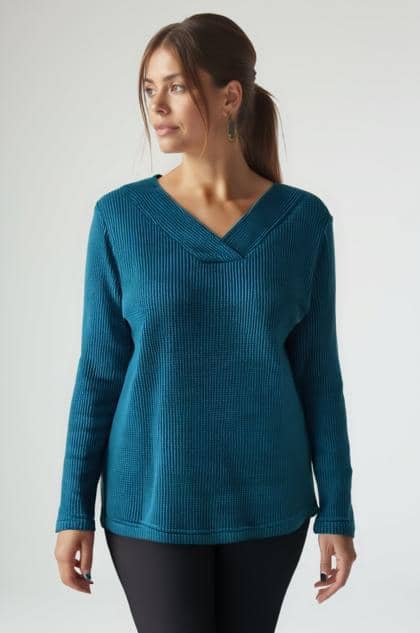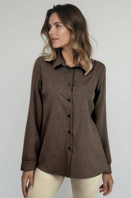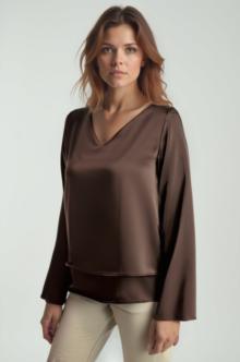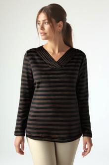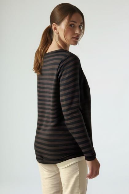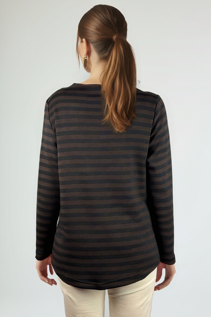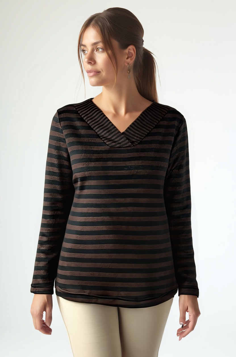 A warm and soft striped sweater, perfect for fall and winter. The V-neck with a textured insert accentuates the décolleté, while the relaxed fit ensures freedom of movement. The chocolate and black stripes create a refined and understated effect. Versatile and feminine, it's ideal for the modern, curvy woman who loves combining style and comfort every day.