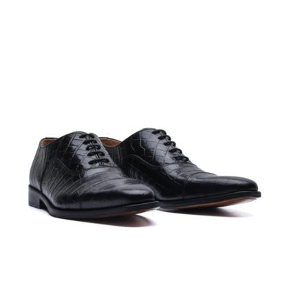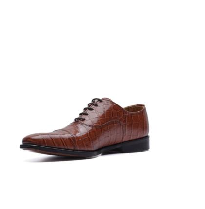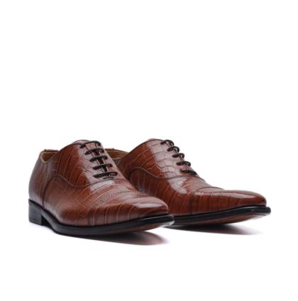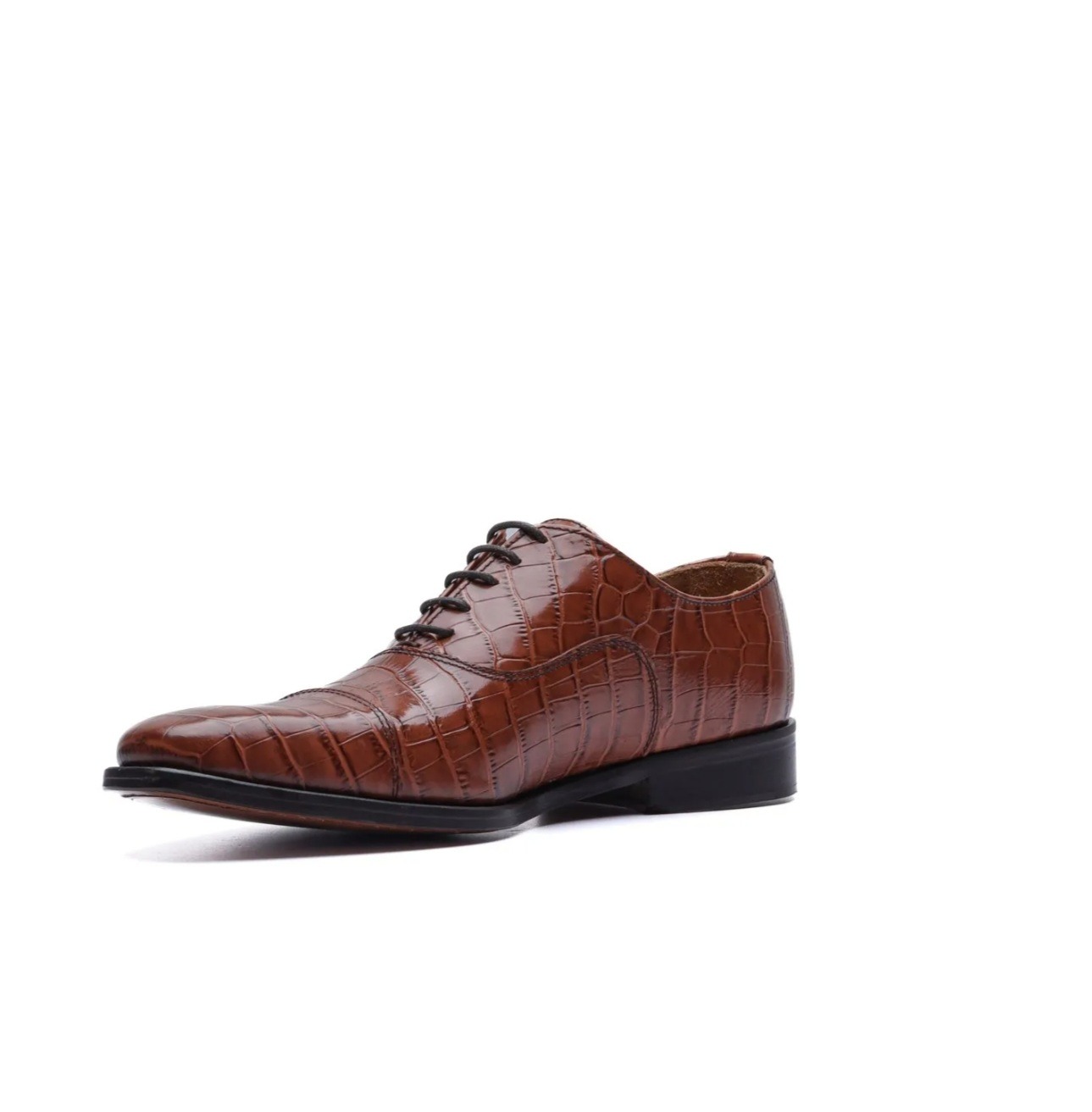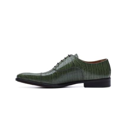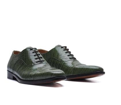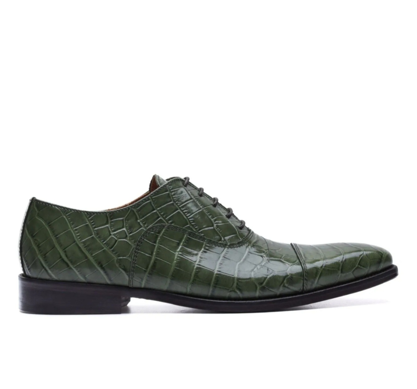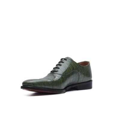 Handcrafted, Made in Italy, Oxford-style lace-ups, also known as "Francesine," feature a crocodile-effect print across the entire upper and toe cap. Crafted from hand-dyed green crocodile-print calfskin. Beige leather lining with printed cursive logo. Blake-worked leather sole with crena detailing, hand-dyed in beige. Perfect with both tailored suits and more casual outfits, designed for the connoisseur seeking timeless footwear. These handmade shoes combine the history, elegance, comfort, and durability typical of Made in Italy products with the unique style of Alessandro Collection Italy.