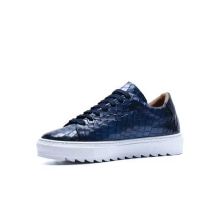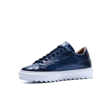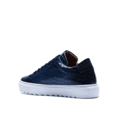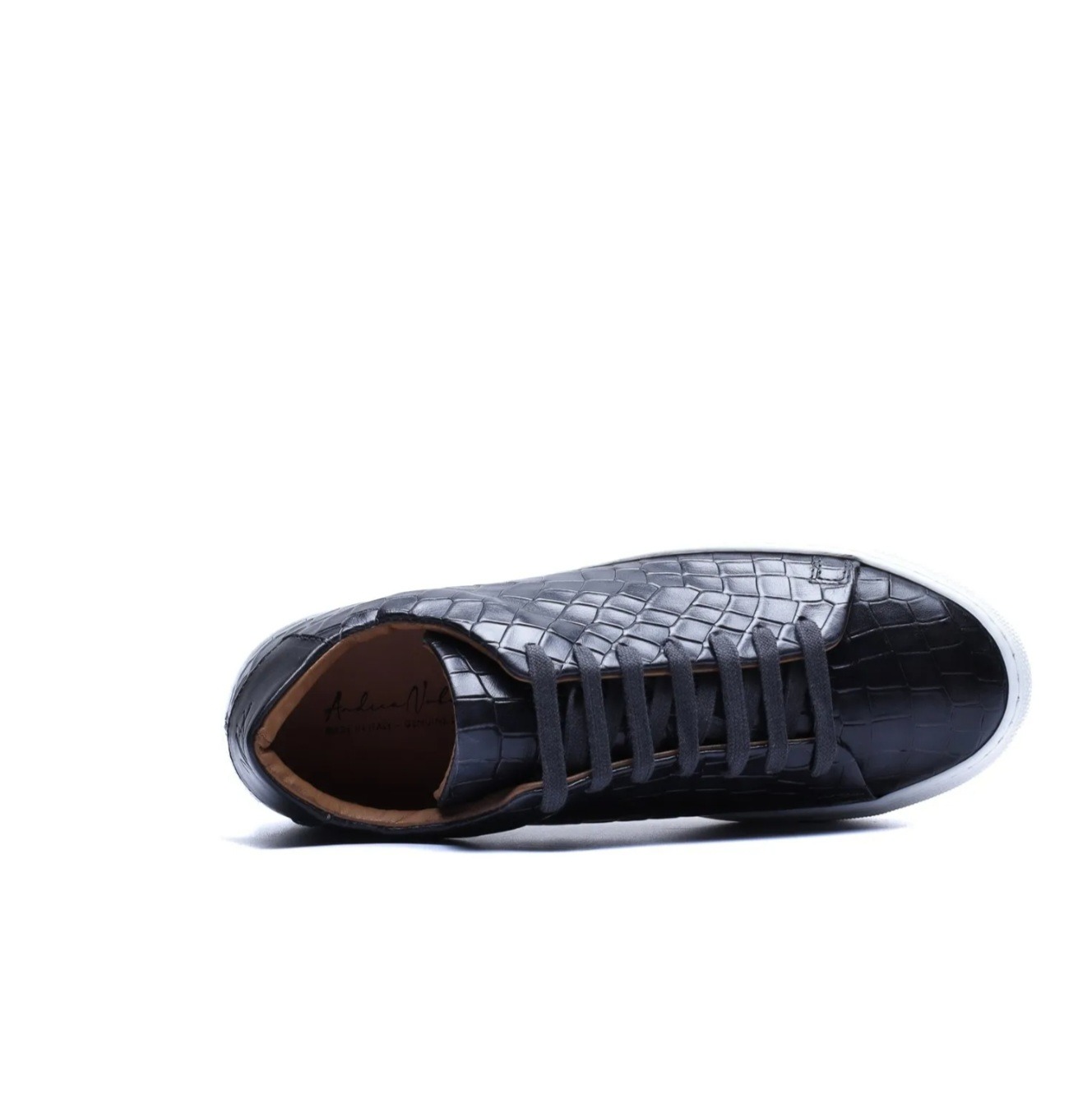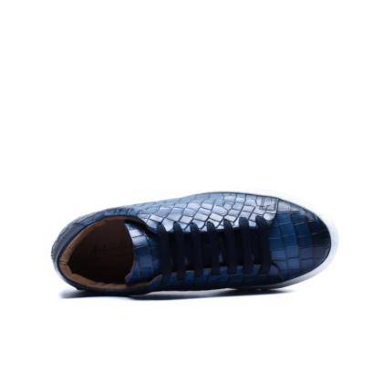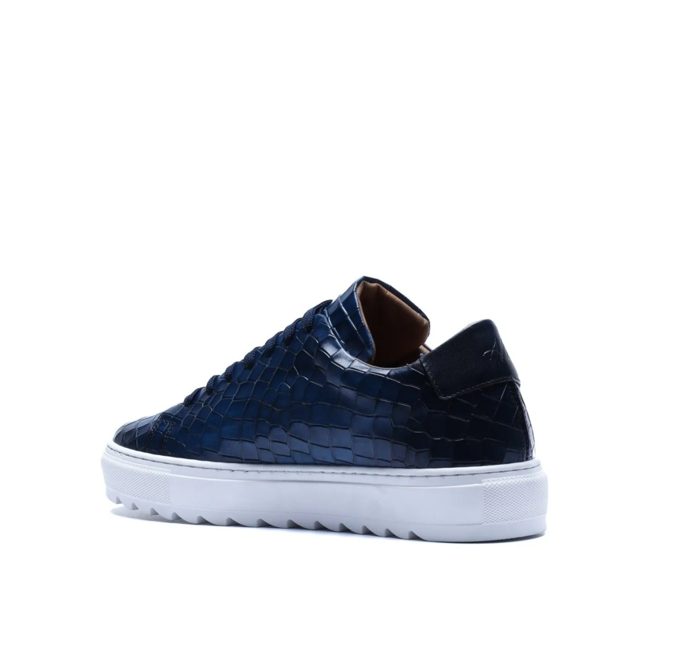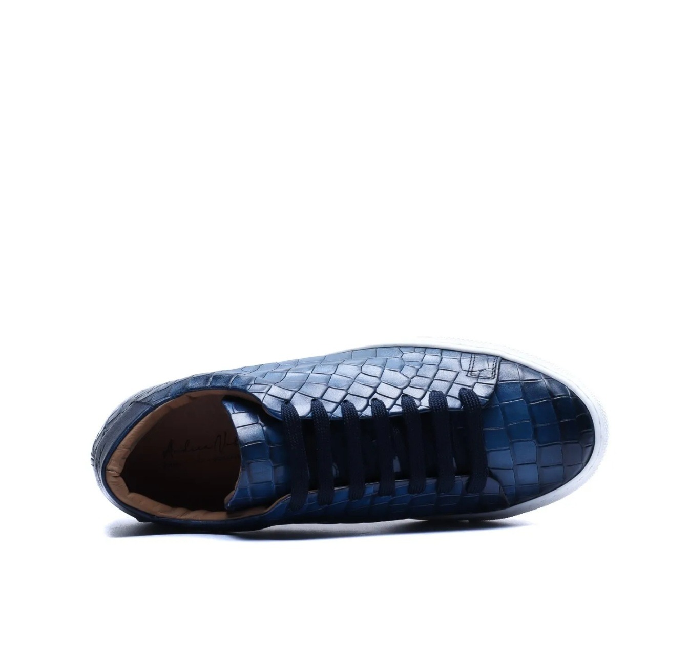 Made in Italy sneaker crafted from genuine hand-dyed blue leather with natural hues, embellished with a glossy crocodile-print leather upper that elegantly reflects the light, yet still retains an urban vibe. Engraved initials in cursive on the sweatband. The white rubber sharktooth outsole adds sleekness and character to the shoe's profile, ensuring comfort and grip on any surface. The soft leather lining ensures comfort even during prolonged wear. A sneaker designed for refined streetwear outfits: perfect under a matching sweatshirt for a luxurious touch, or paired with casual looks for a whimsical touch.