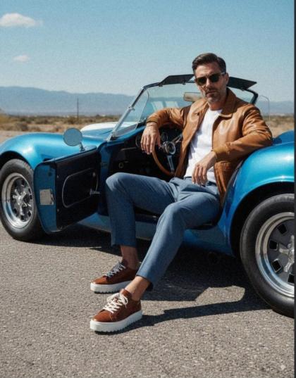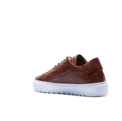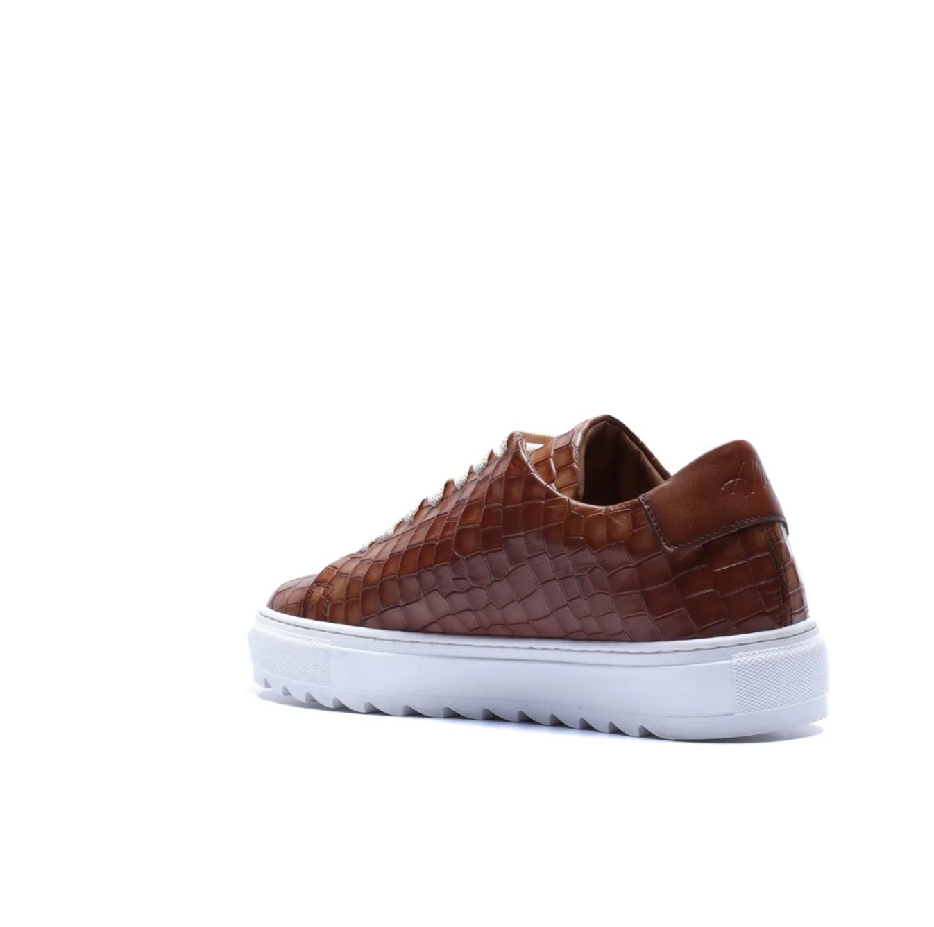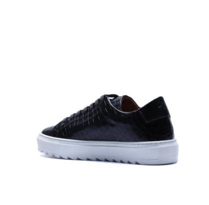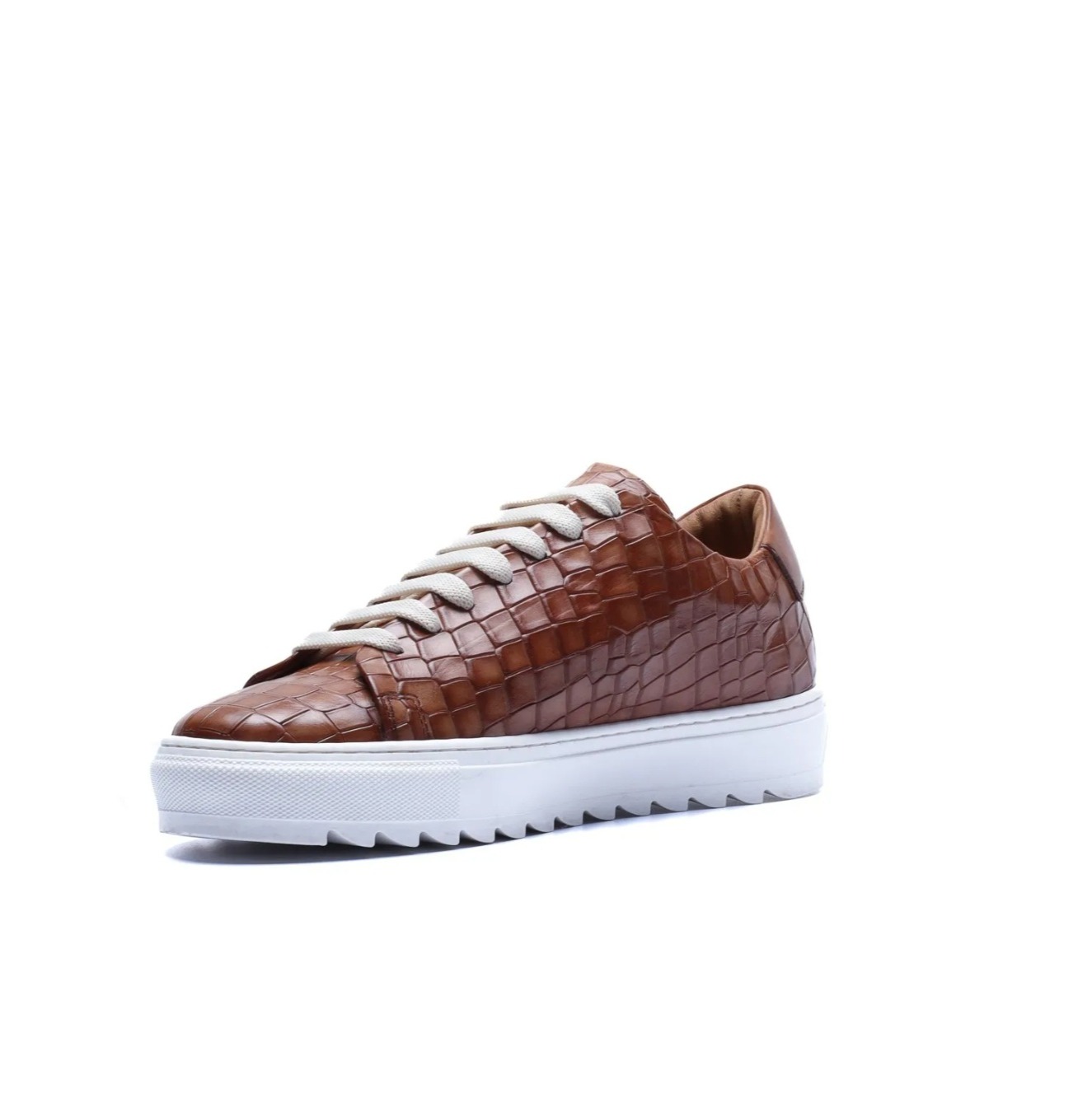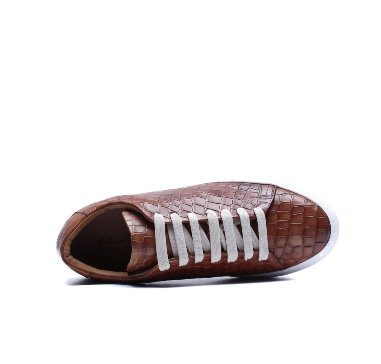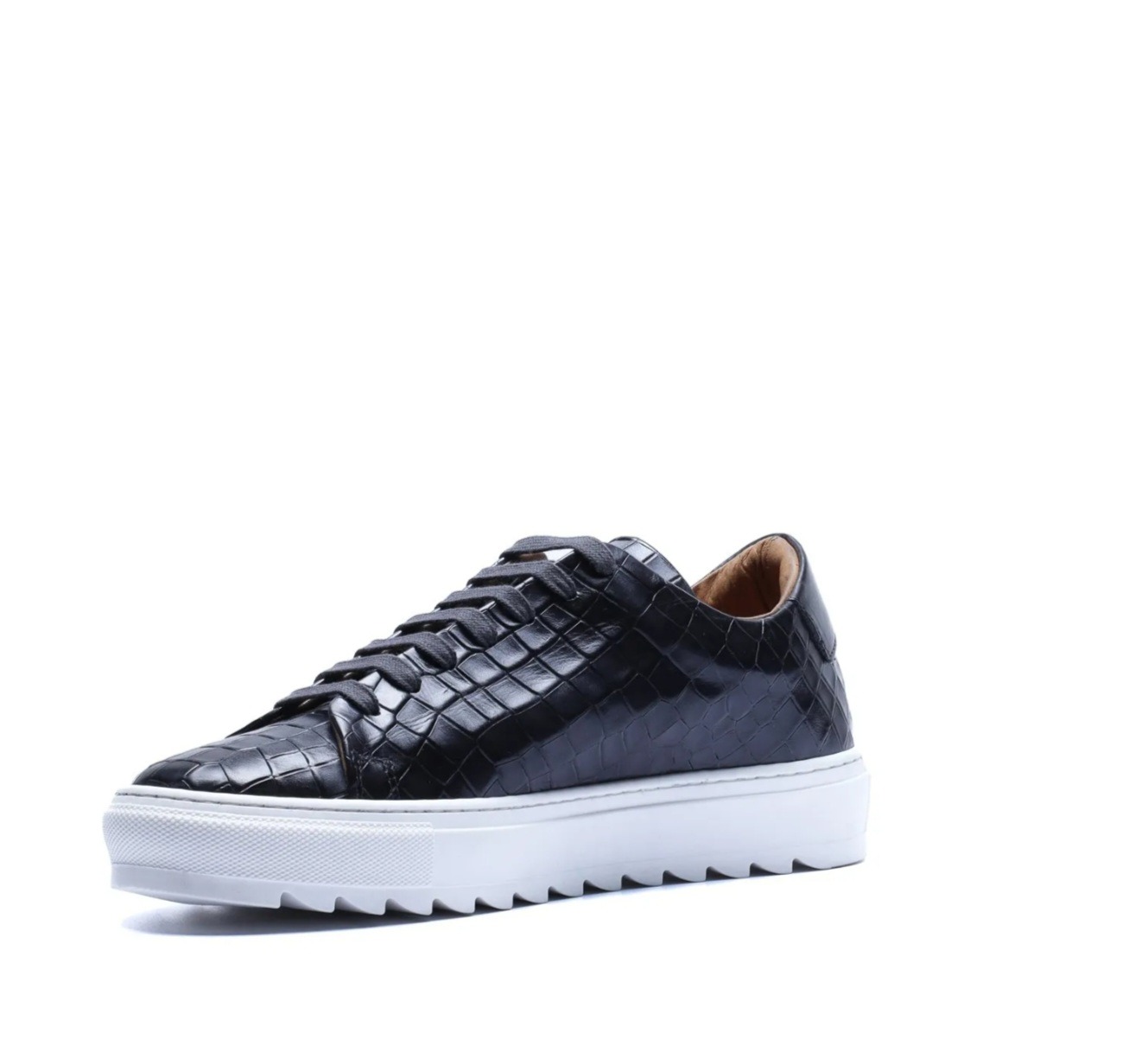 Made in Italy sneaker crafted from genuine hand-dyed blue leather with natural hues, embellished with a glossy crocodile-print leather upper that elegantly reflects the light, yet still retains an urban vibe. Engraved initials in cursive on the sweatband. The white rubber sharktooth outsole adds sleekness and character to the shoe's profile, ensuring comfort and grip on any surface. The soft leather lining ensures comfort even during prolonged wear. A sneaker designed for refined streetwear outfits: perfect under a matching sweatshirt for a luxurious touch, or paired with casual looks for a whimsical touch.