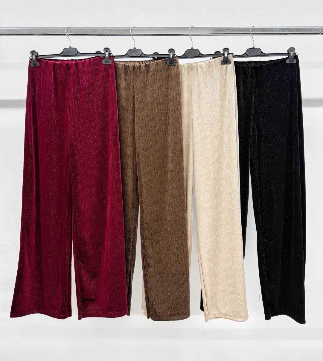 These luxurious full-length pants are crafted from sumptuous velvet, offered in a refined palette of burgundy, taupe brown, creamy ivory, and classic black. Featuring a high-rise elastic waistband, they deliver both comfort and a flattering silhouette without the need for closures or buttons. The straight, wide-leg cut embodies effortless chic, while the subtle vertical texture of the velvet fabric adds a tactile element, reflecting light with every movement. The pants' unadorned design enhances their versatility, easily transitioning from relaxed loungewear to elevated casual or semi-formal attire. With a relaxed fit that drapes fluidly, they suit all body types and prioritize all-day ease. Designed for women who appreciate both comfort and sophistication, these trousers cater to a demographic aged 20-50, from trendsetters to professionals seeking a touch of Italian finesse. Best suited for cooler weather, the plush velvet fabric provides warmth and enduring elegance. The construction is clean and minimal, with neat hems emphasizing quality craftsmanship.