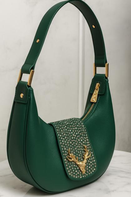 Half-moon leather bag meticulously crafted from premium leather, featuring a luminous strass-embellished flap that adds a touch of refined brilliance. The design is completed by an elegant circular brass detail, enhancing the bag’s sculptural silhouette and highlighting its Italian artisanal craftsmanship. A sophisticated statement piece that balances contemporary elegance with timeless luxury.
