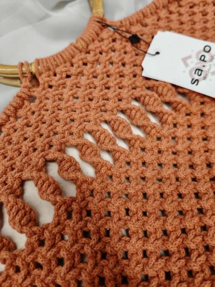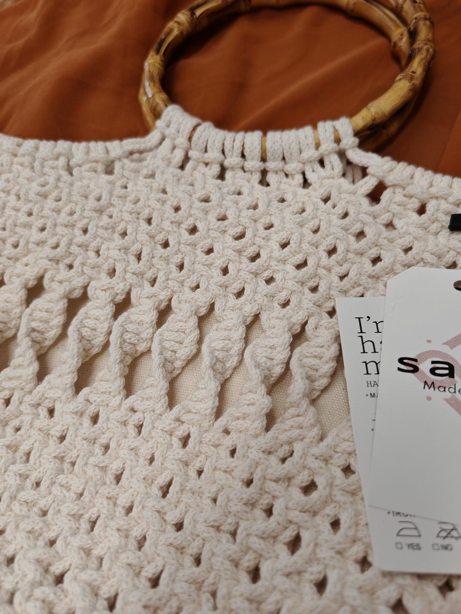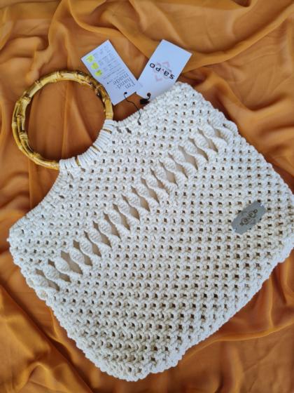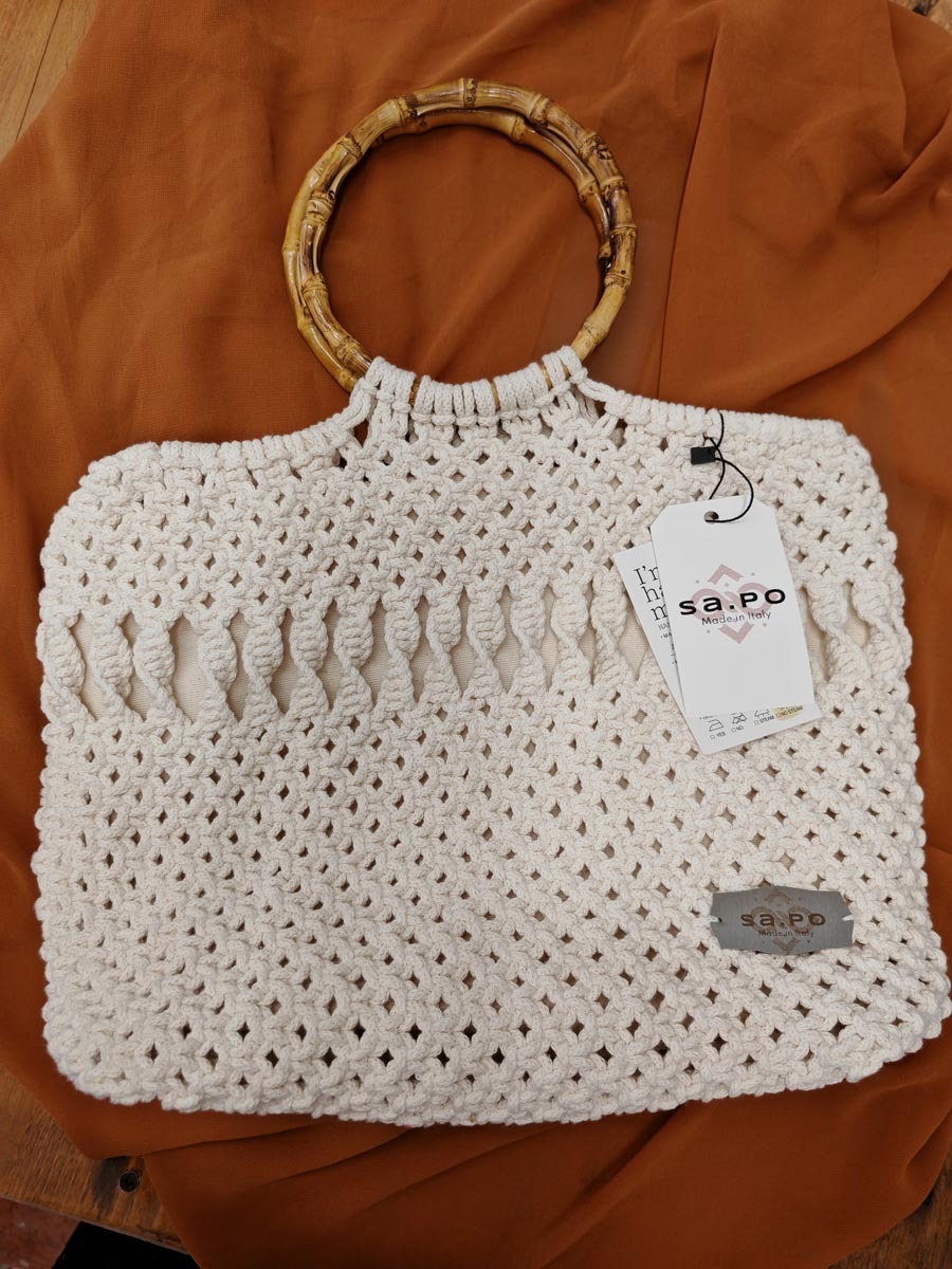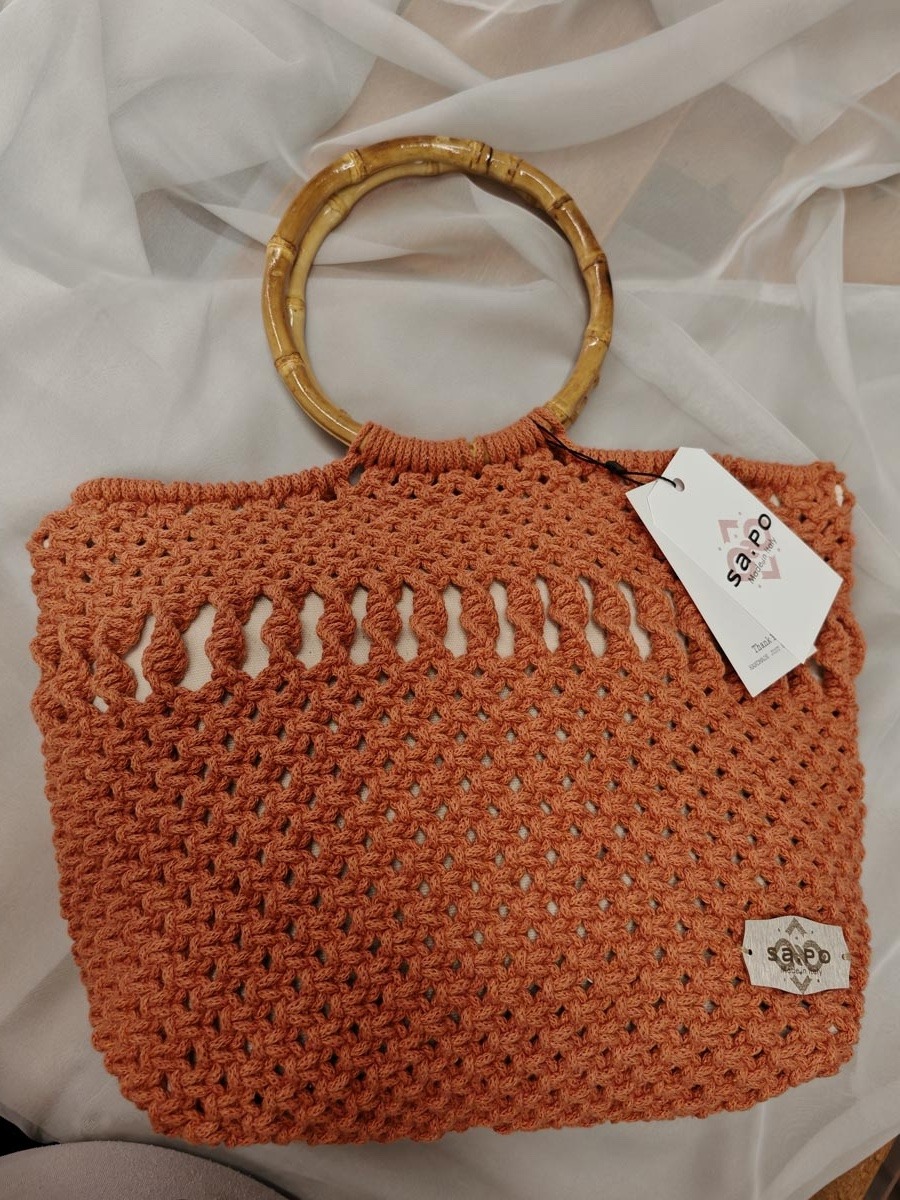 A design that evokes the depths of caves, symbolic and protected places of the Cherokee people. The woven workmanship creates an interplay of volumes and spaces that evoke the hidden beauty of nature, transforming this bag into an object of authentic and refined charm.