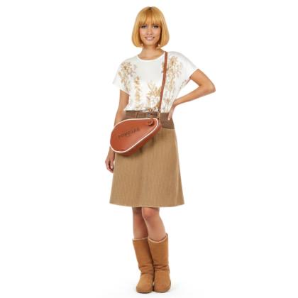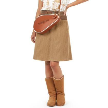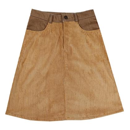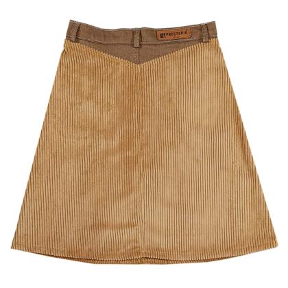 High-quality velvet and denim skirt. The waistband and yoke are made of brown denim, while the rest is made of soft, silky caramel-colored corduroy. Side pockets. Knee-length. Entirely made in-house by Prestorik Italia.