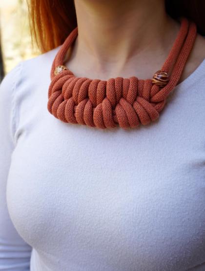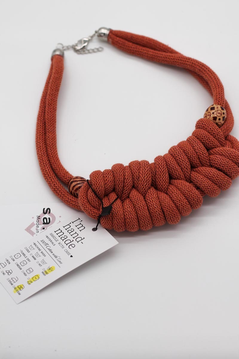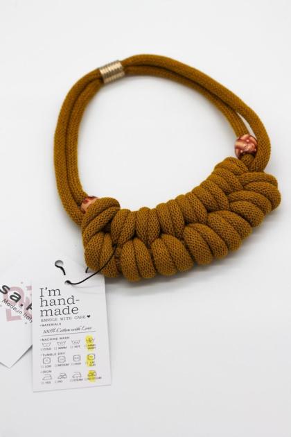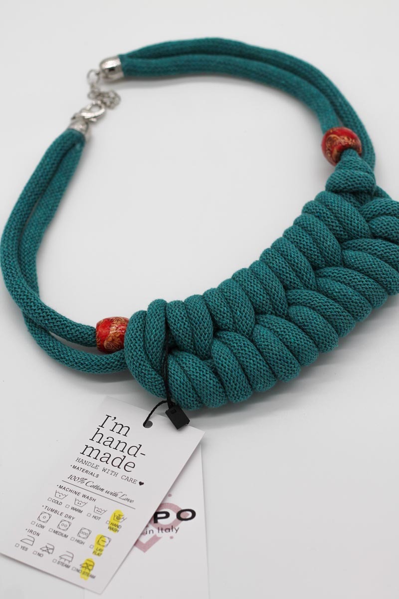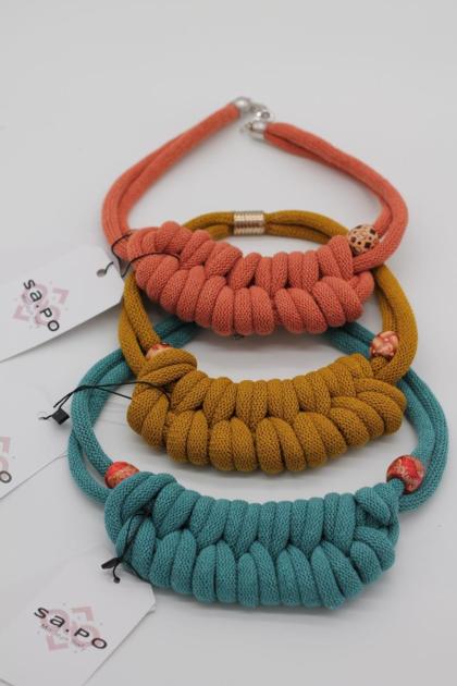 An accessory that combines craftsmanship and imagination, designed for those who love to express their personality through detail. This necklace is entirely handmade from recycled cotton and features a sculptural central braid, crafted with precision to create a bold yet harmonious visual impact. The hypoallergenic metal clasp ensures comfort and security, making it suitable for all skin types. Available in a variety of colors and designs, it's the perfect accessory to add character to even the simplest look. An original, lightweight, and conscious textile jewel, ideal for those who choose a personal and sustainable style.