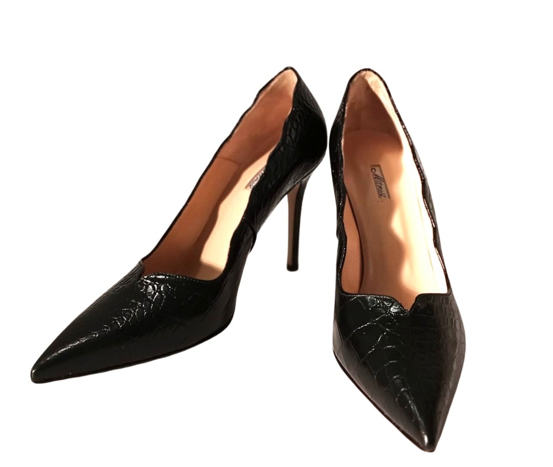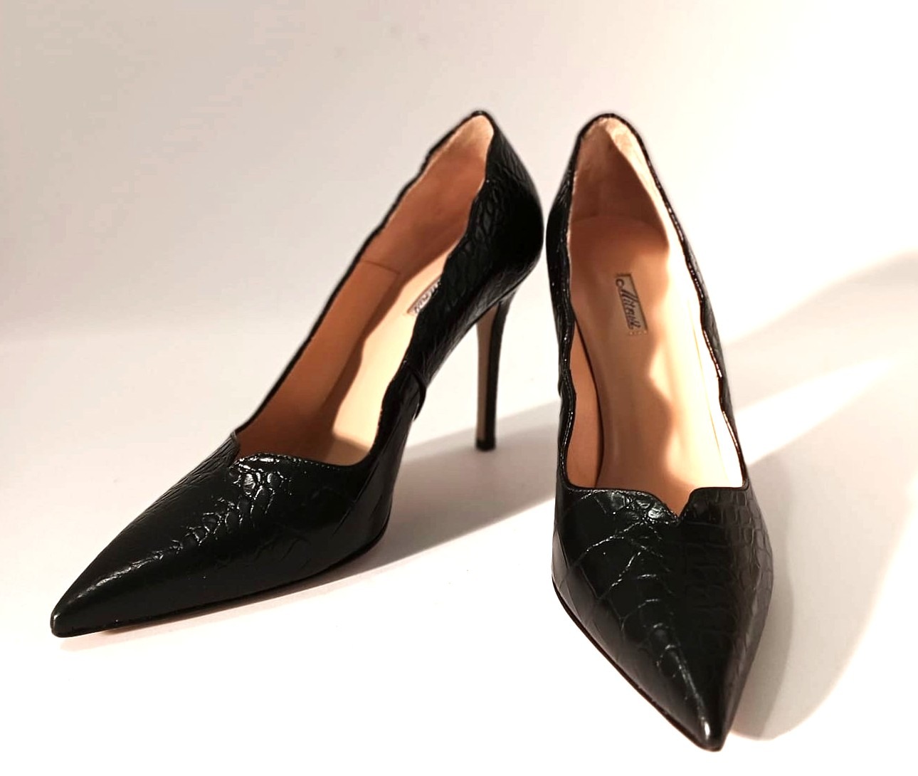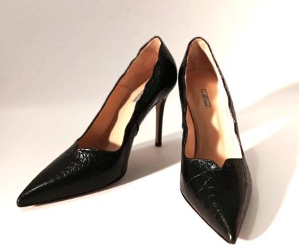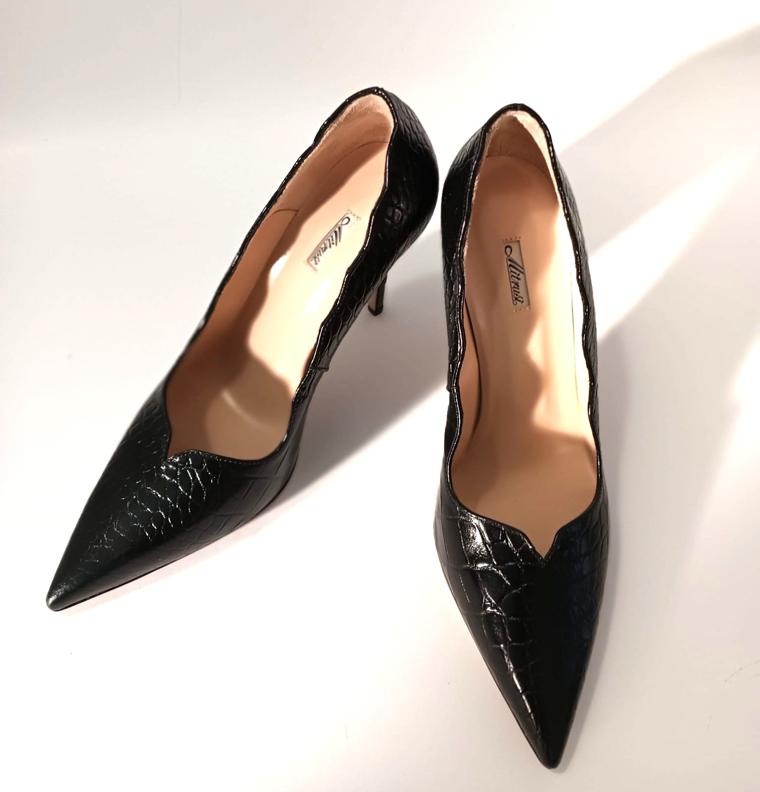 Upper: Black crocodile print calfskin Shape/Heel: Rapid 100 Sole: Natural leather + black smooth Italian artisan product