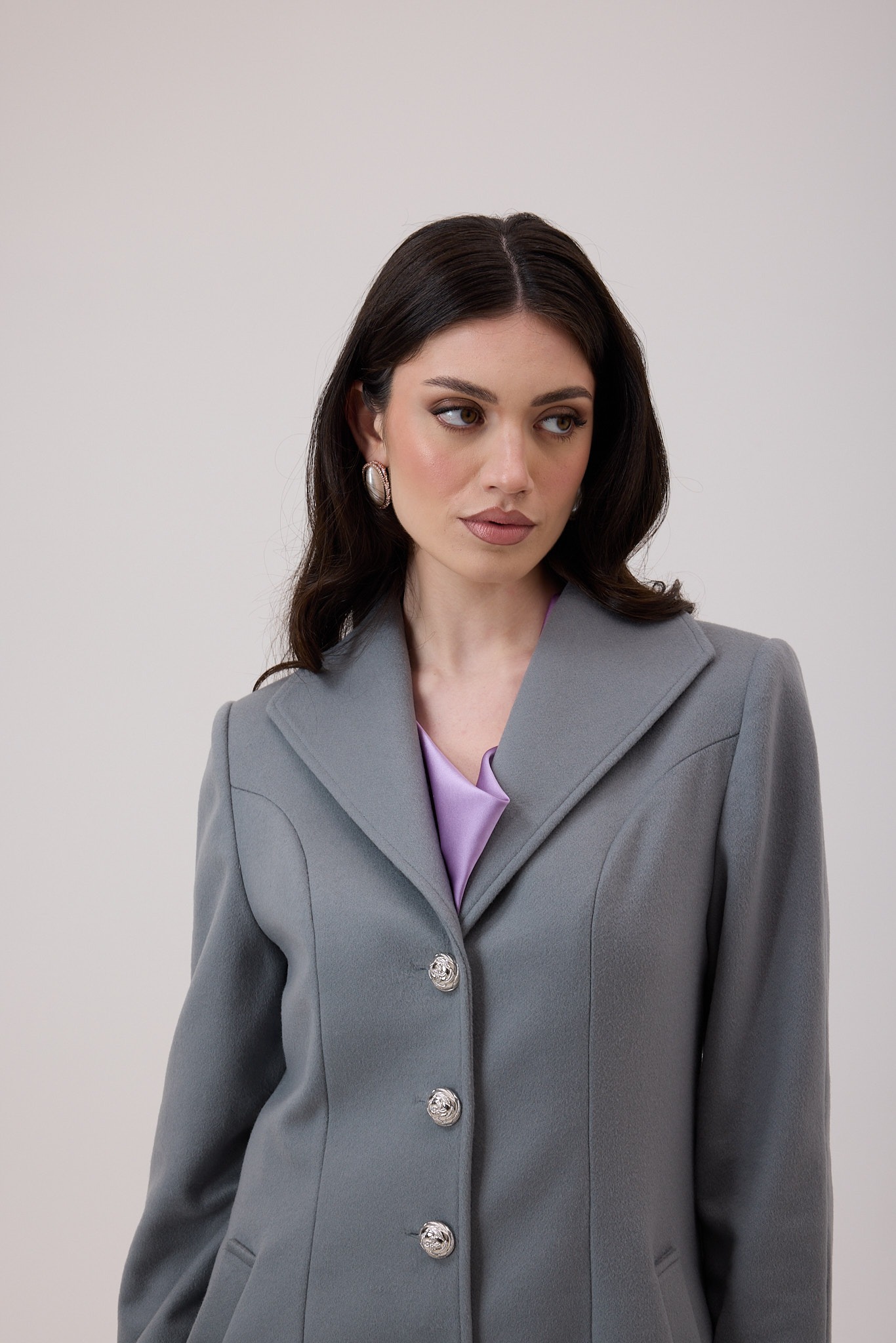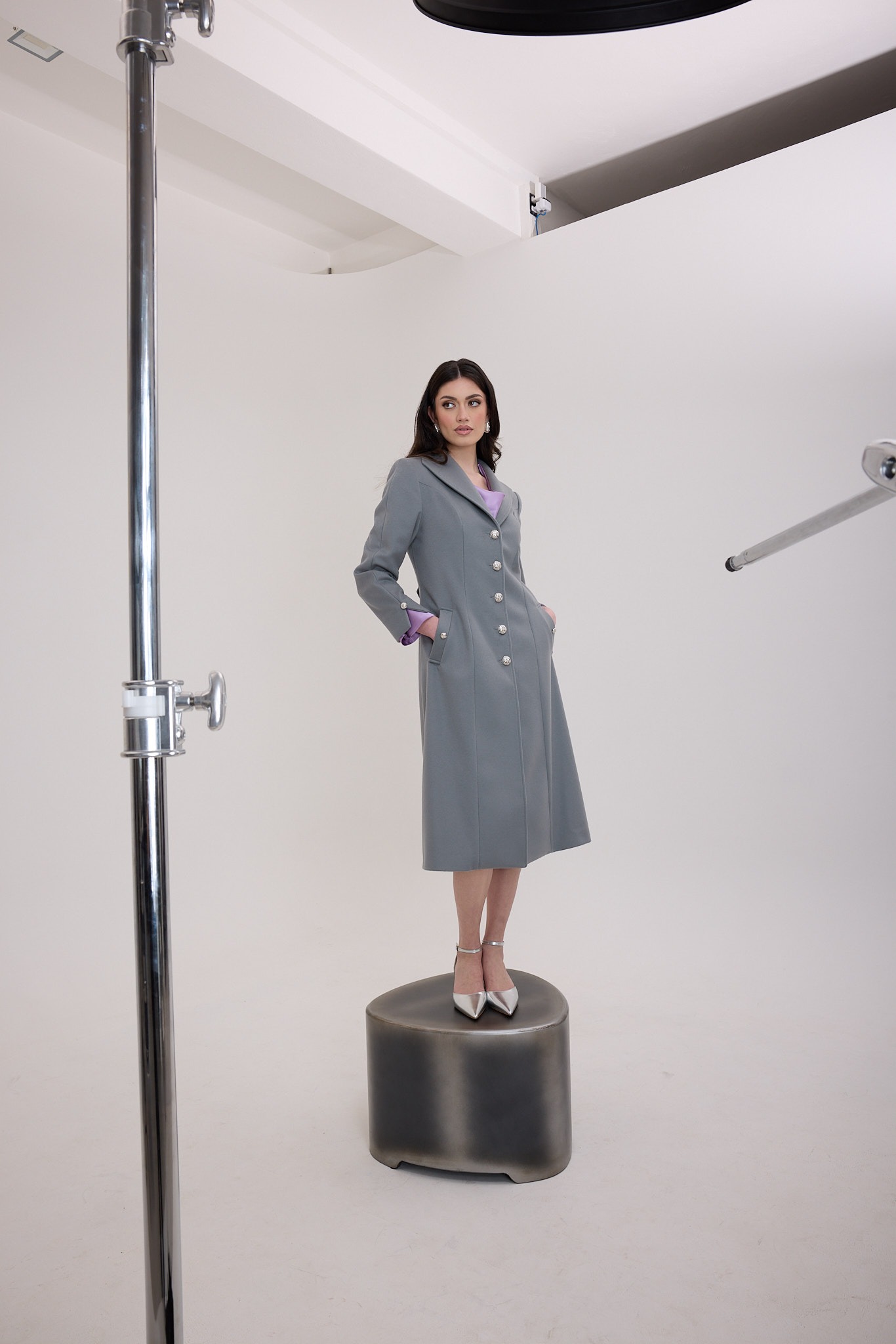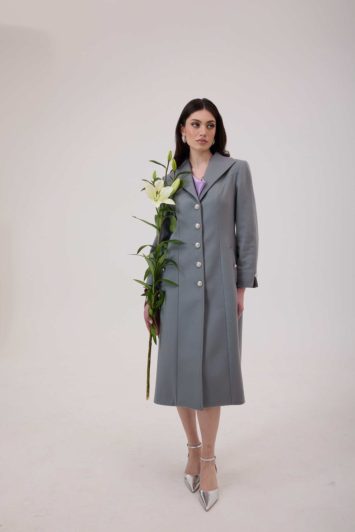 This stunning midi coat features an elegant, sharply pointed wide lapel collar that enhances the garments sophisticated silhouette. The full-length sleeves are finished with decorative pearl-like buttons at the cuff, adding a distinctive touch of refinement. Crafted in a serene dove grey, the dominant color evokes an understated, tranquil mood that radiates quiet confidence and modern elegance. The coat is ideal for formal occasions, business meetings, or high-end daytime events, but its timeless cut ensures effortless versatility for smart-casual city wear. Tailored for the discerning modern woman, the fit is structured yet gently skimming, accentuating the figure without restriction. Crystal-embellished statement buttons run down the front, providing subtle sparkle and elevating the coats unique appeal. Precise top-stitching, sharp seams, and luxurious, smooth fabric highlight the expert Italian craftsmanship. Mid-weight and fully lined, this coat is best suited for mild to cool climates, making it a staple for autumn, winter, or early spring. With a calf-length, A-line silhouette, it speaks to sophisticated, style-oriented professionals who value luxury and longevity in their wardrobe. This is a premium, luxury piece created for a woman who demands both substance and style. Available also in Cobalt Blue