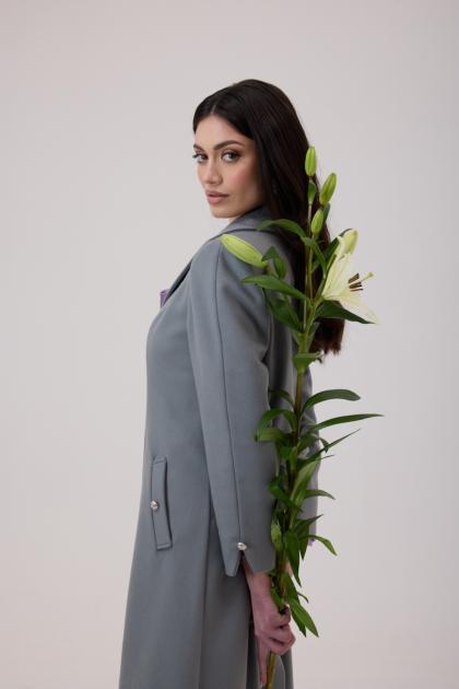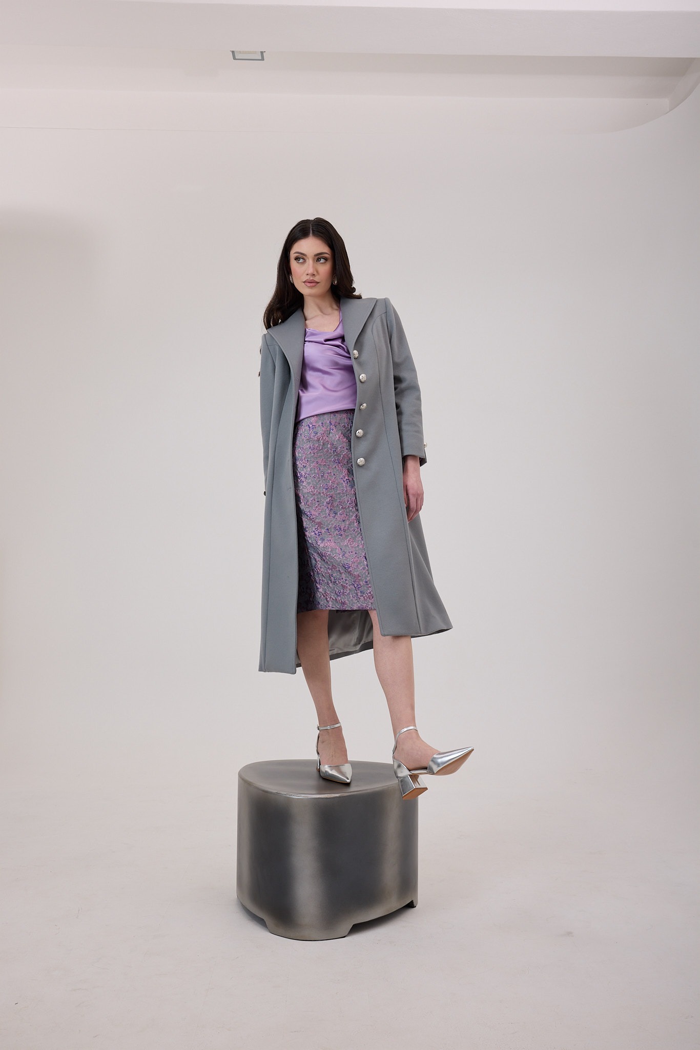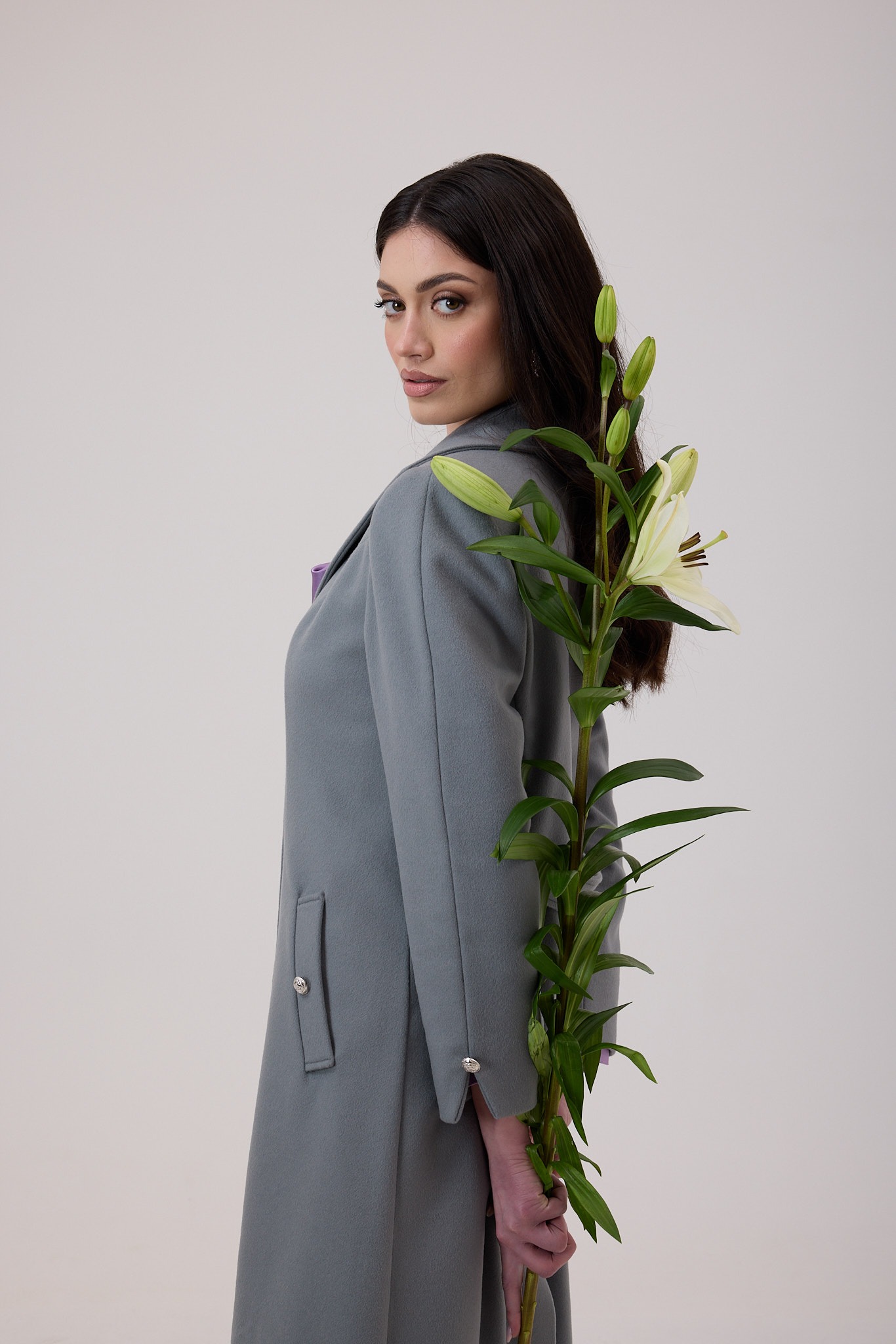 This stunning midi coat features an elegant, sharply pointed wide lapel collar that enhances the garments sophisticated silhouette. The full-length sleeves are finished with decorative pearl-like buttons at the cuff, adding a distinctive touch of refinement. Crafted in a serene dove grey, the dominant color evokes an understated, tranquil mood that radiates quiet confidence and modern elegance. The coat is ideal for formal occasions, business meetings, or high-end daytime events, but its timeless cut ensures effortless versatility for smart-casual city wear. Tailored for the discerning modern woman, the fit is structured yet gently skimming, accentuating the figure without restriction. Crystal-embellished statement buttons run down the front, providing subtle sparkle and elevating the coats unique appeal. Precise top-stitching, sharp seams, and luxurious, smooth fabric highlight the expert Italian craftsmanship. Mid-weight and fully lined, this coat is best suited for mild to cool climates, making it a staple for autumn, winter, or early spring. With a calf-length, A-line silhouette, it speaks to sophisticated, style-oriented professionals who value luxury and longevity in their wardrobe. This is a premium, luxury piece created for a woman who demands both substance and style. Available also in Cobalt Blue