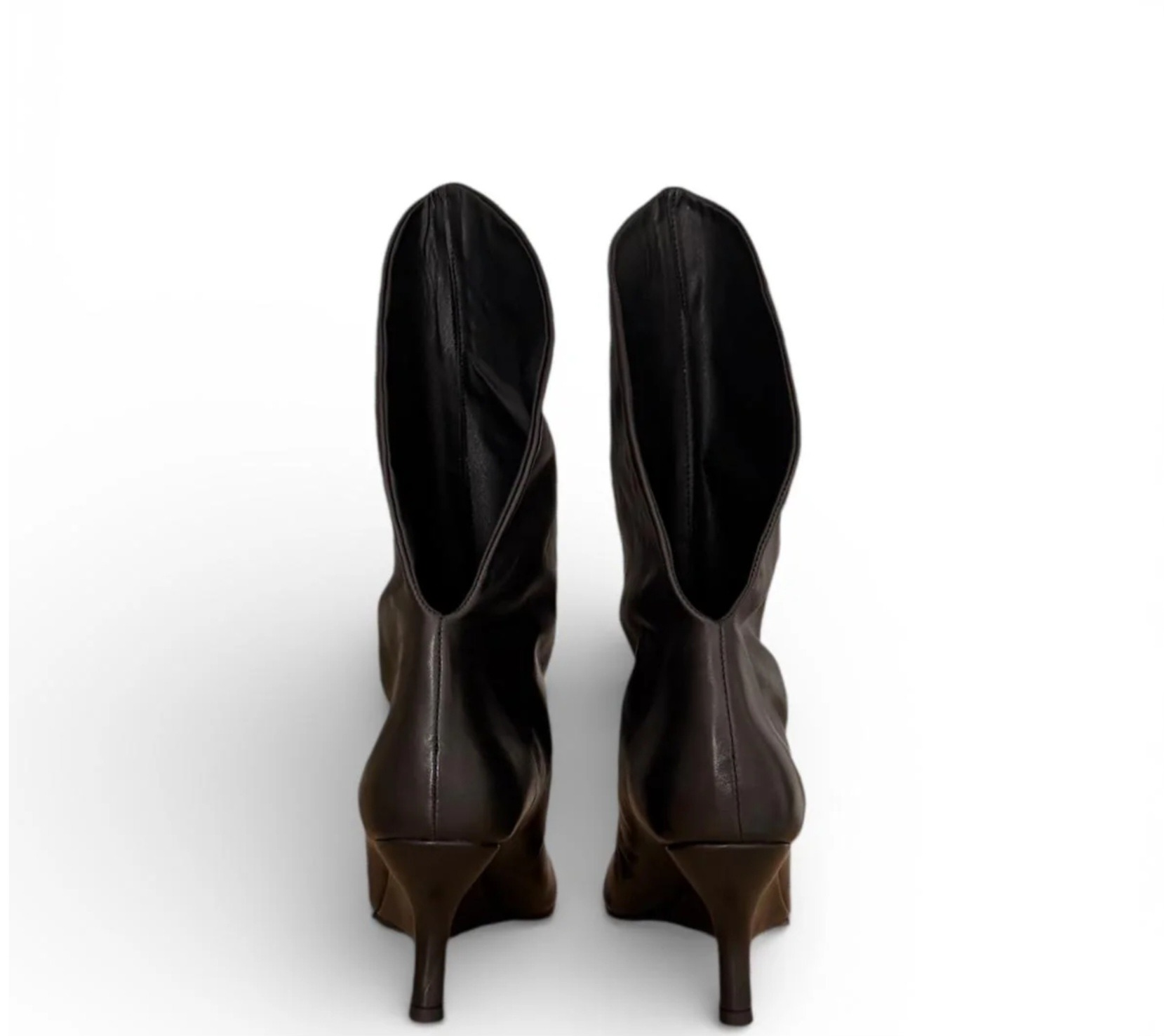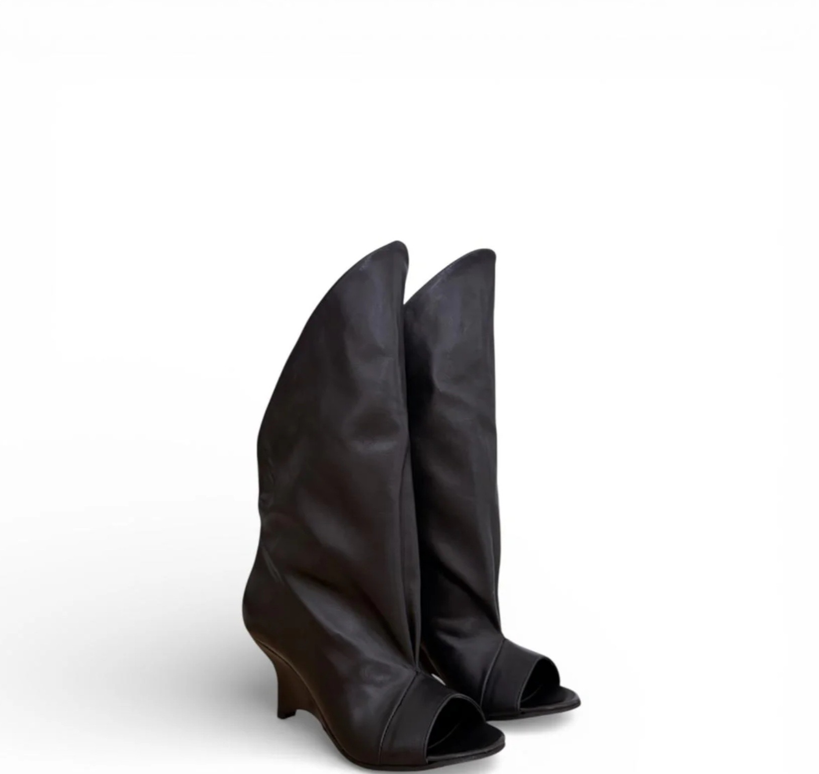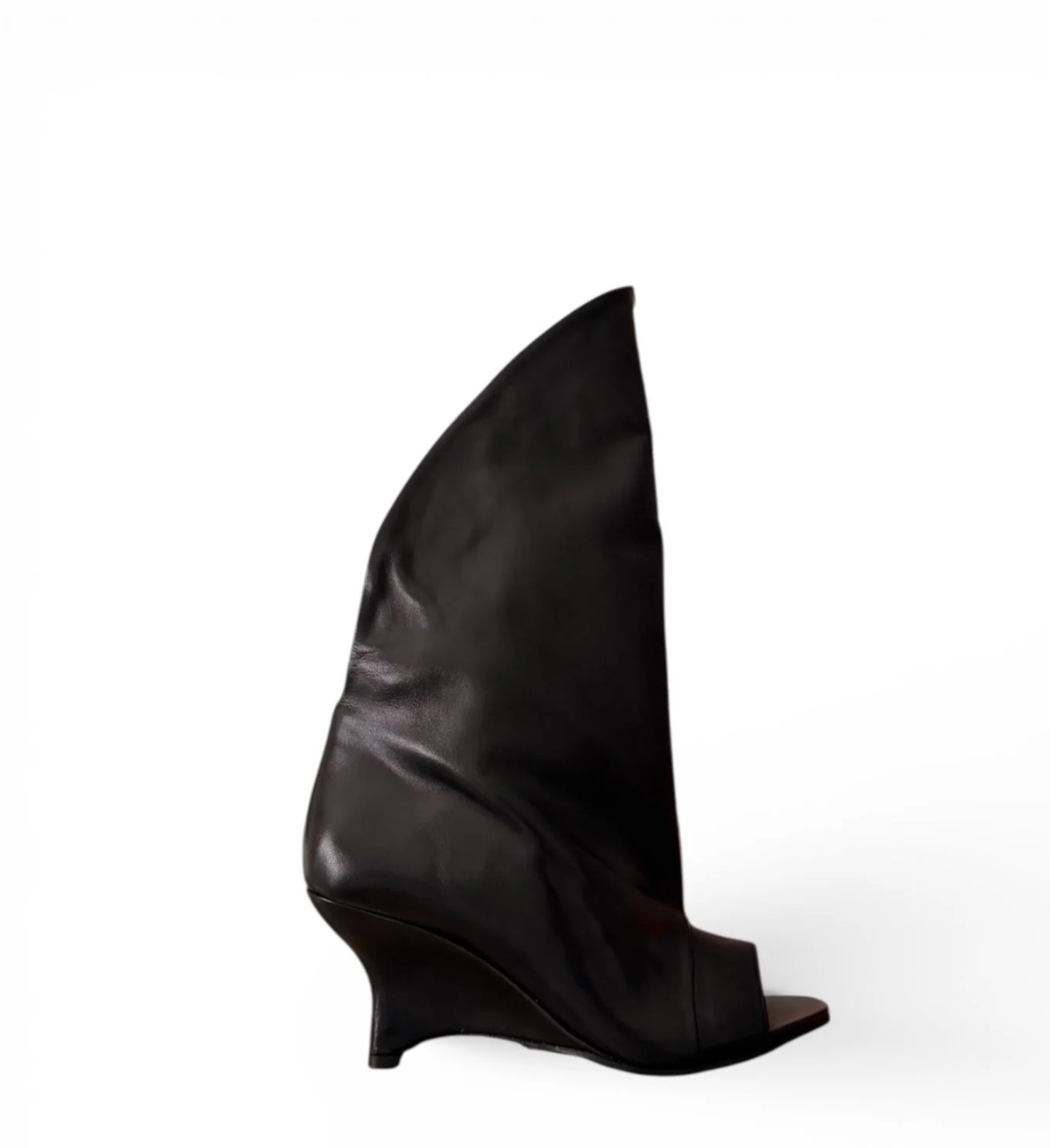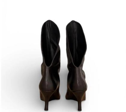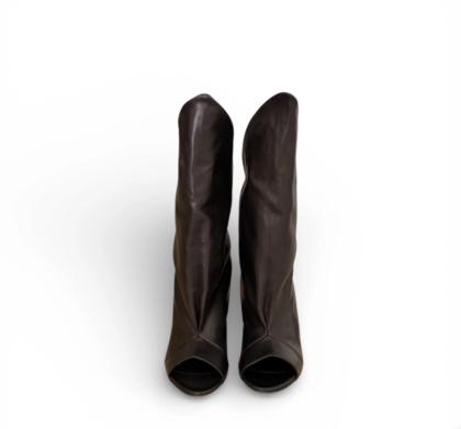 Black leather peep-toe ankle boot with an irregular heel. This design features a unique irregular heel that enhances stability while providing a contemporary aesthetic. The use of high-quality black leather contributes to its durability. 7 cm heel.