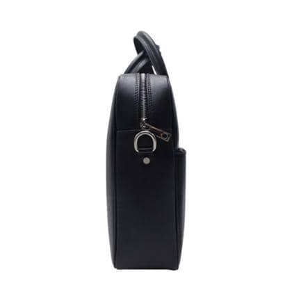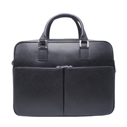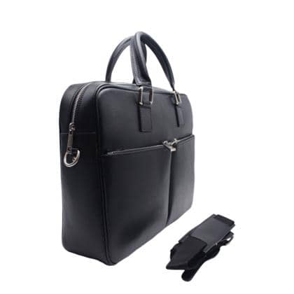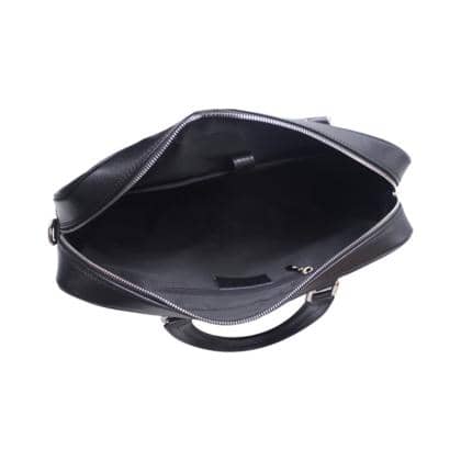 Briefcase in semi-rigid leather, elegant and comfortable, has two front pockets closed by zip. Inside fabric, equipped with two pockets for objects, one with zip and one with tongue in leather. It has an adjustable shoulder strap in leather and fabric, zip and metal details.