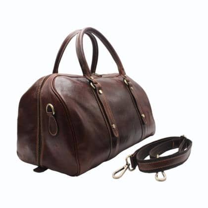 Travel bag in real leather, resistant and stiff at the right point. The bag features a removable and adjustable shoulder strap. Very spacious, it can hold large quantities, making the trip really comfortable. It is possible to carry it by hand or shoulder, the design is catchy and the style is a vintage to the latest fashion. The inside part is in fabric and has a zip pocket on one side and a pocket for objects on the other. Below is equipped with small feet for support.