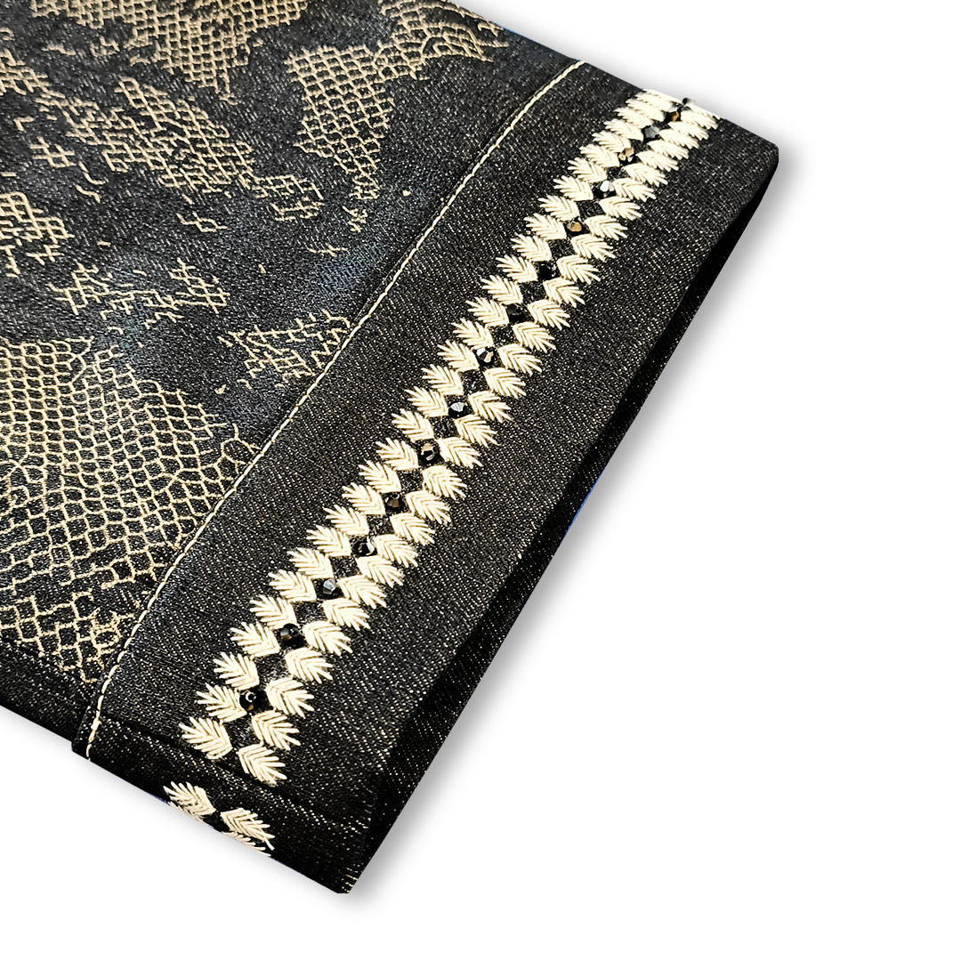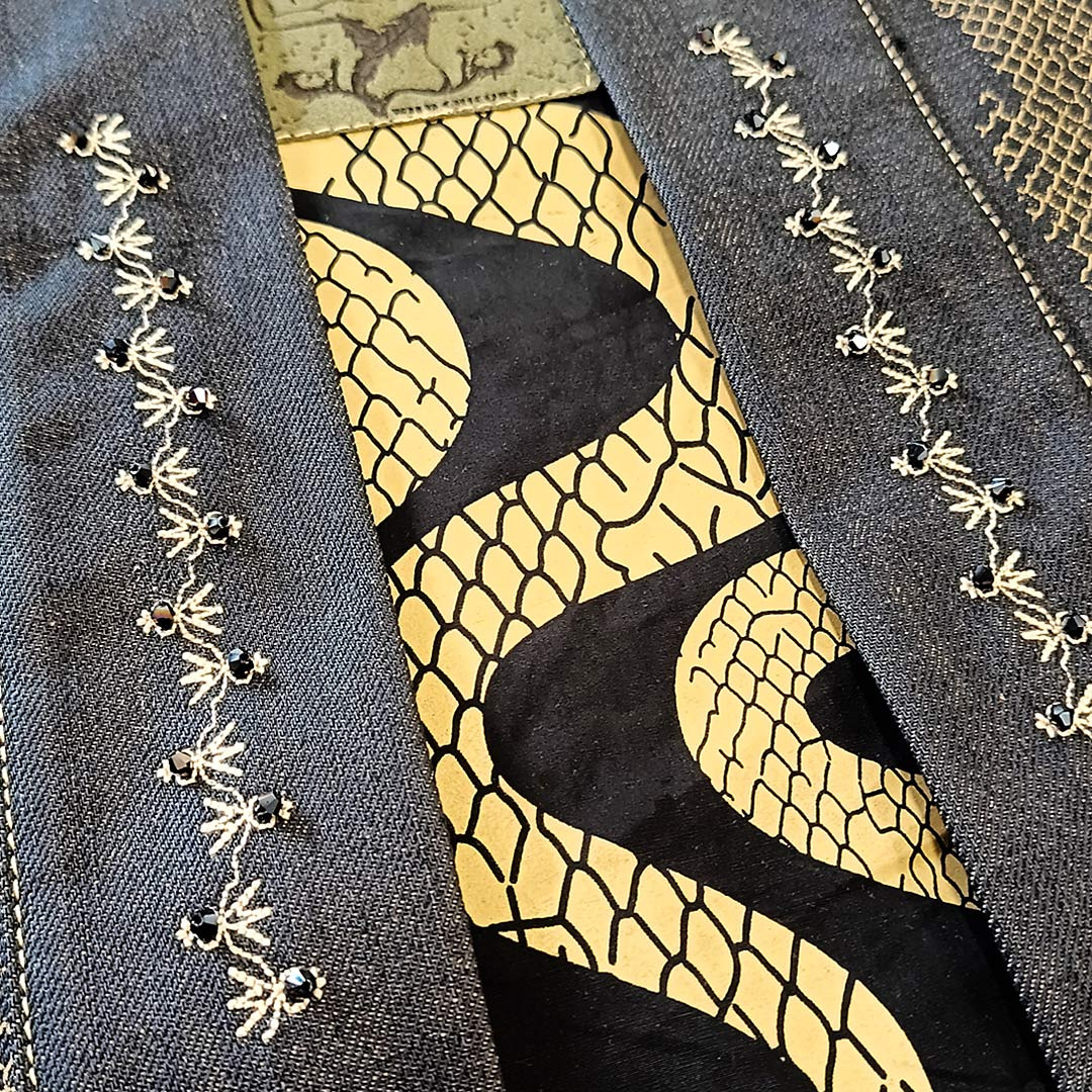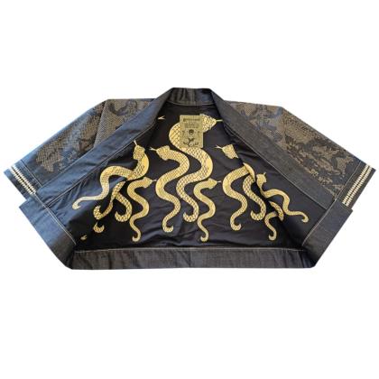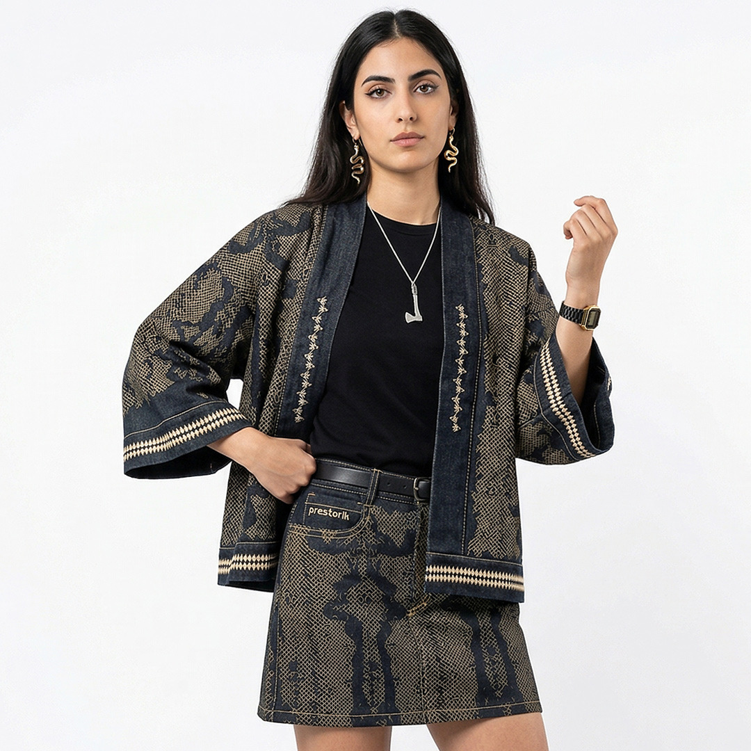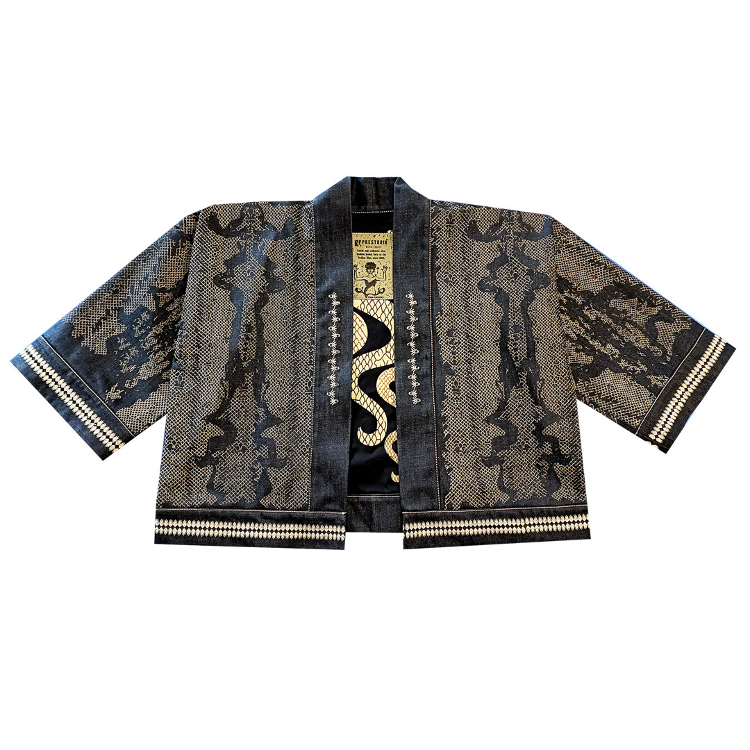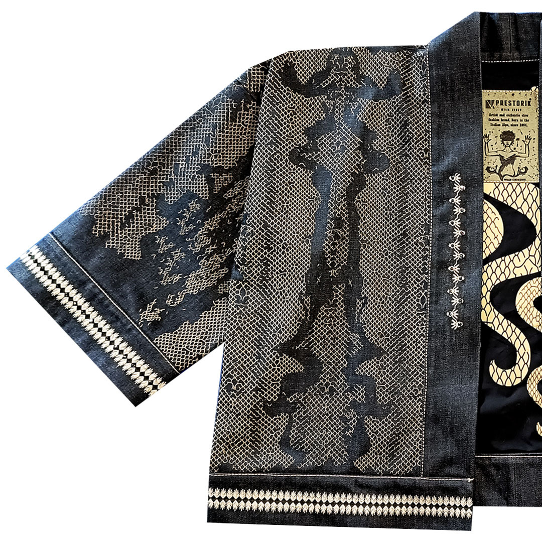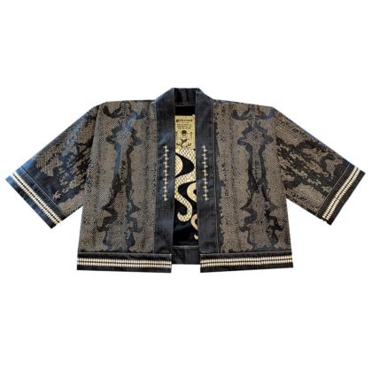 Cropped black denim kimono jacket with 100% printed cotton poplin lining. Leaf embroidery along the sleeves and hem. Handcrafted screen printing imitating viper skin. Made in Italy.